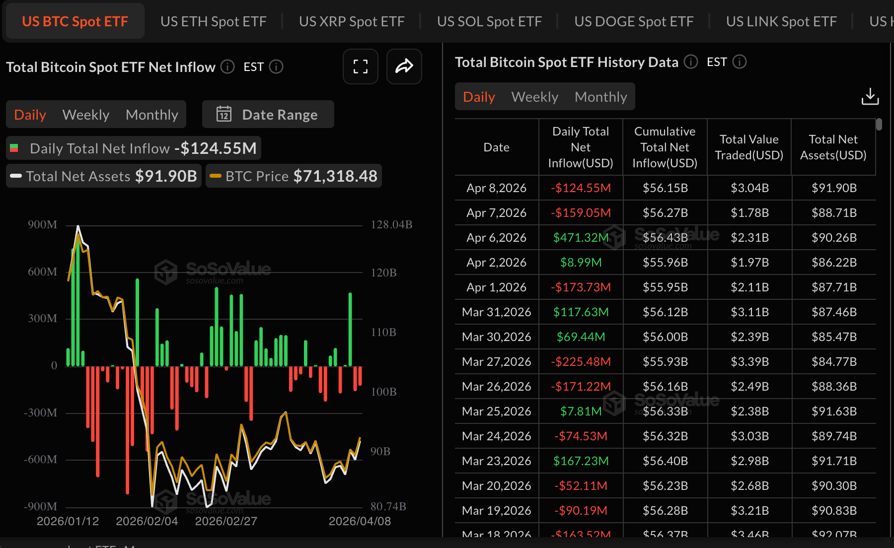 Meanwhile, investors appear to be sitting on the sidelines, as reflected in outflows from Exchange-Traded Funds (ETFs). SoSoValue data shows that nearly $125 million was withdrawn from US-listed BTC spot ETFs on Wednesday, bringing the cumulative inflows to $56.15 billion and net assets under management to $91.90 billion.