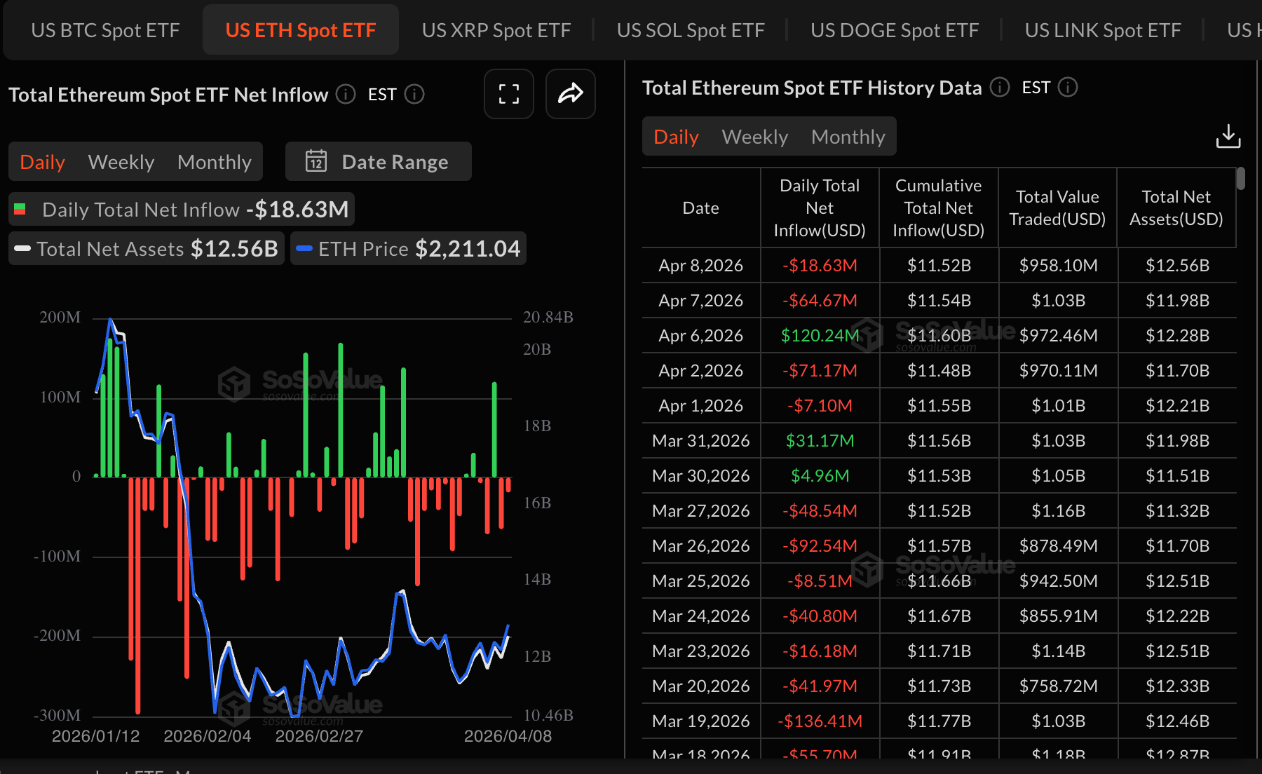 Ethereum ETFs also suffered outflows totaling nearly $19 million on Wednesday, extending the bearish streak from Tuesday when roughly $65 million was withdrawn from the US-listed investment products. Cumulative inflows stand at $11.52 billion, and net assets under management at $12.96 billion.