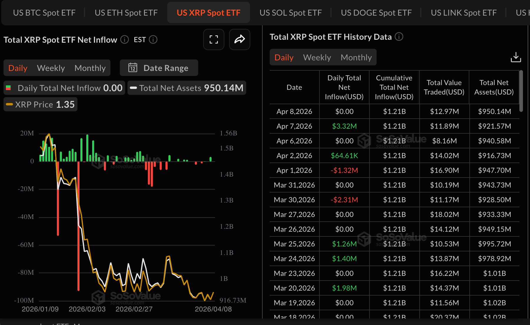 Meanwhile, activity in XRP spot ETFs remained muted on Wednesday, with cumulative inflows steadying at $1.21 billion and net assets at approximately $950 million.