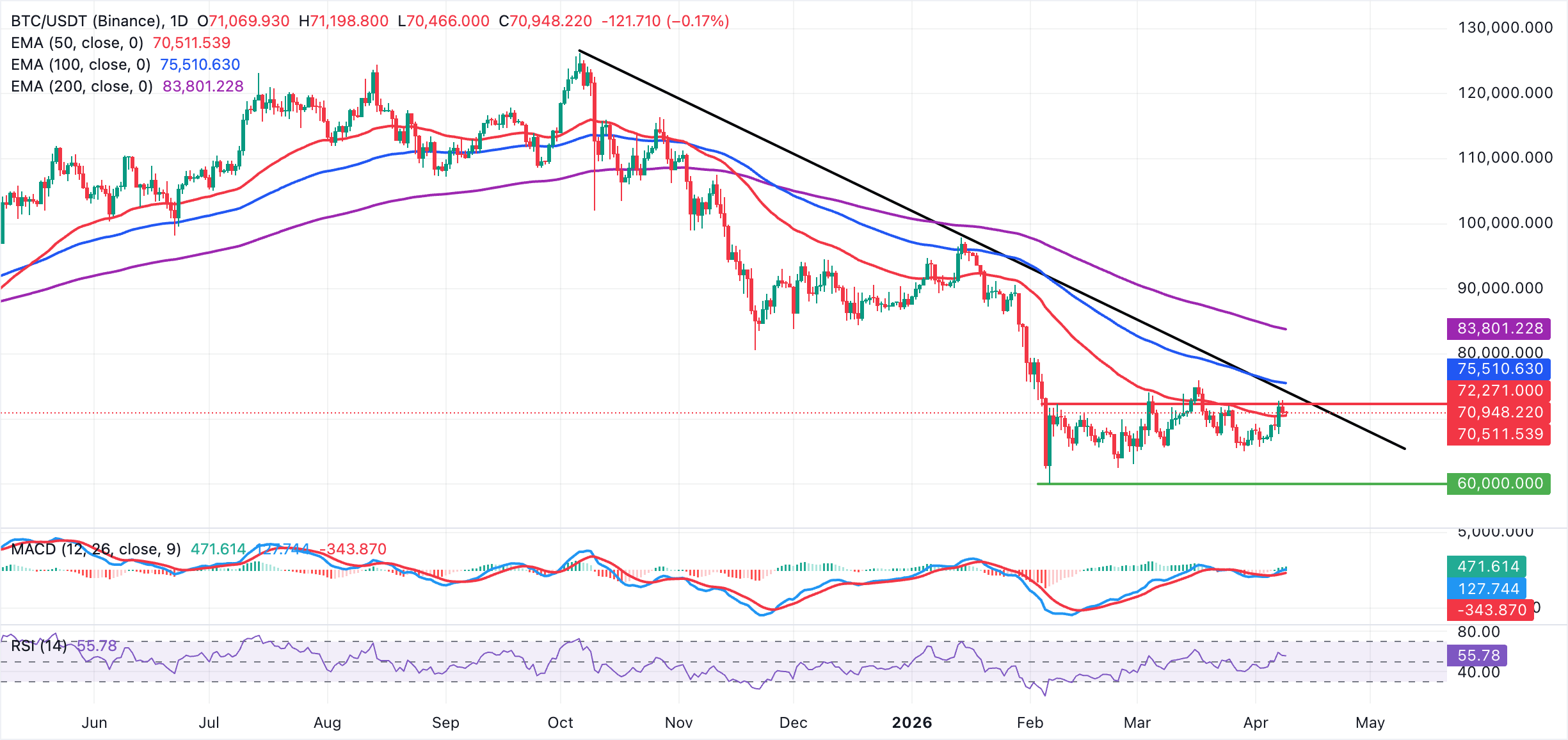 Bitcoin is trading at around $70,950 at the time of writing on Thursday, retaining a constructive near-term bias as it holds above the 50-day Exponential Moving Average (EMA) at roughly $70,512. However, Bitcoin's price remains below the 100-day EMA near $75,511 and the broader downtrend resistance drawn from the all-time high of $126,199, so the bullish tone is still considered a recovery phase rather than a clear breakout.