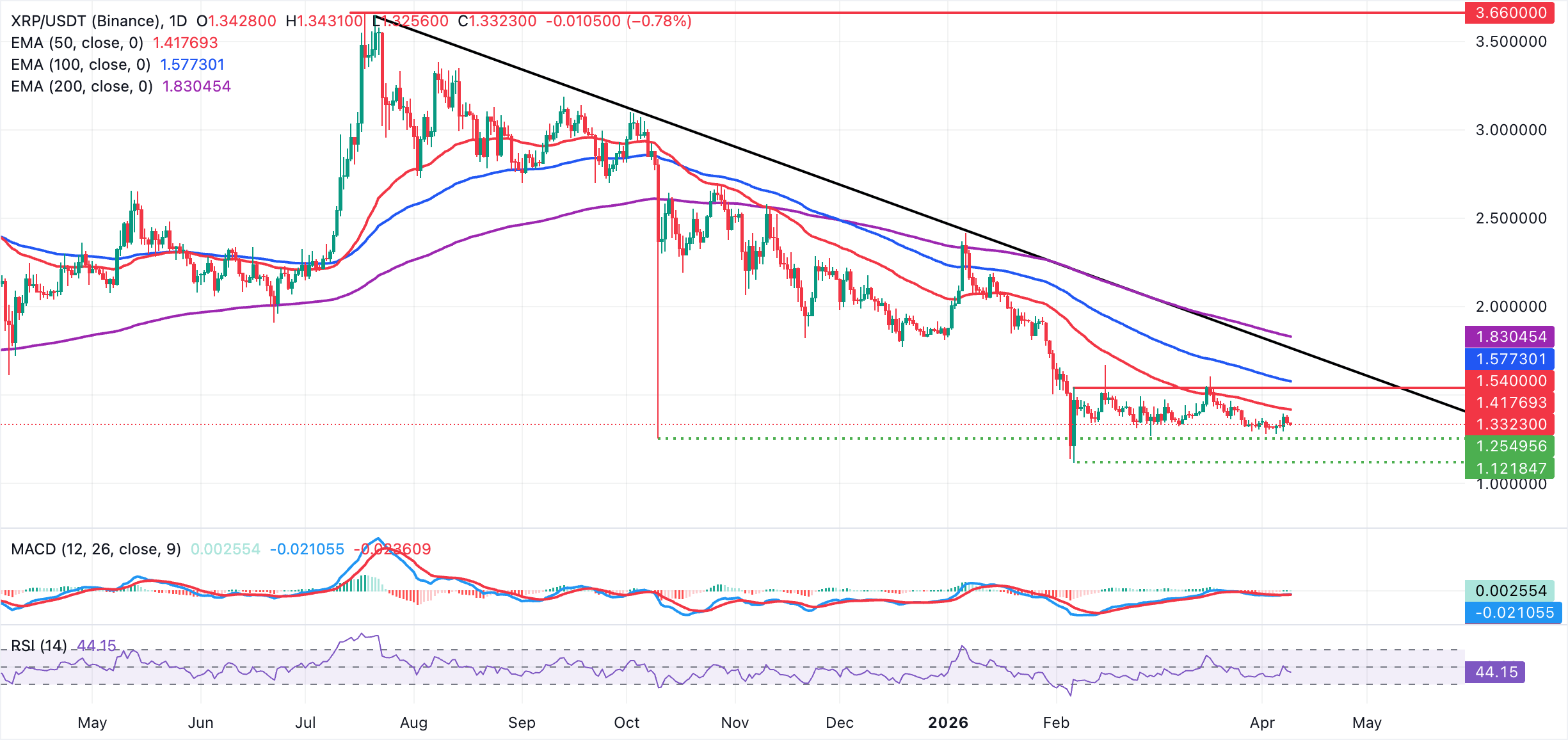 As for XRP, the price remains largely bearish, entrenched below the major moving averages. The 50-day EMA at $1.42 is the nearest dynamic cap, with the 100-day EMA at $1.58 and the 200-day EMA at $1.83 reinforcing a broader downside structure beneath the long-term descending trendline whose break level sits much higher at $1.76. Meanwhile, the MACD indicator is marginally positive and relatively flat, and the RSI at 44 remains in neutral-to-soft territory. XRP's momentum only hints at tentative stabilization rather than a clear bullish turn.