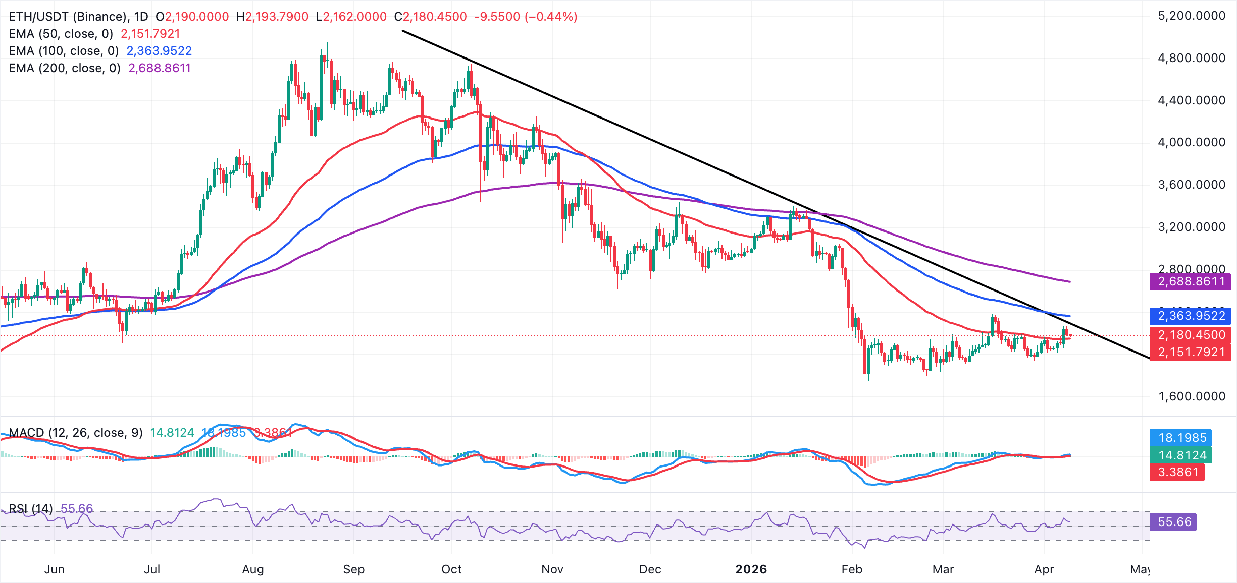 Ethereum's initial resistance is seen at the descending trendline break zone around $2,291. A daily close above this area would open the door toward the 100-day EMA at $2,364, with the 200-day EMA higher up at $2,689 acting as a more distant barrier in case of an extended advance. On the downside, immediate support lies with the 50-day EMA at $2,152, and a clear drop back below this level would undermine the nascent positive tone and expose ETH to deeper consolidation within the broader downtrend.