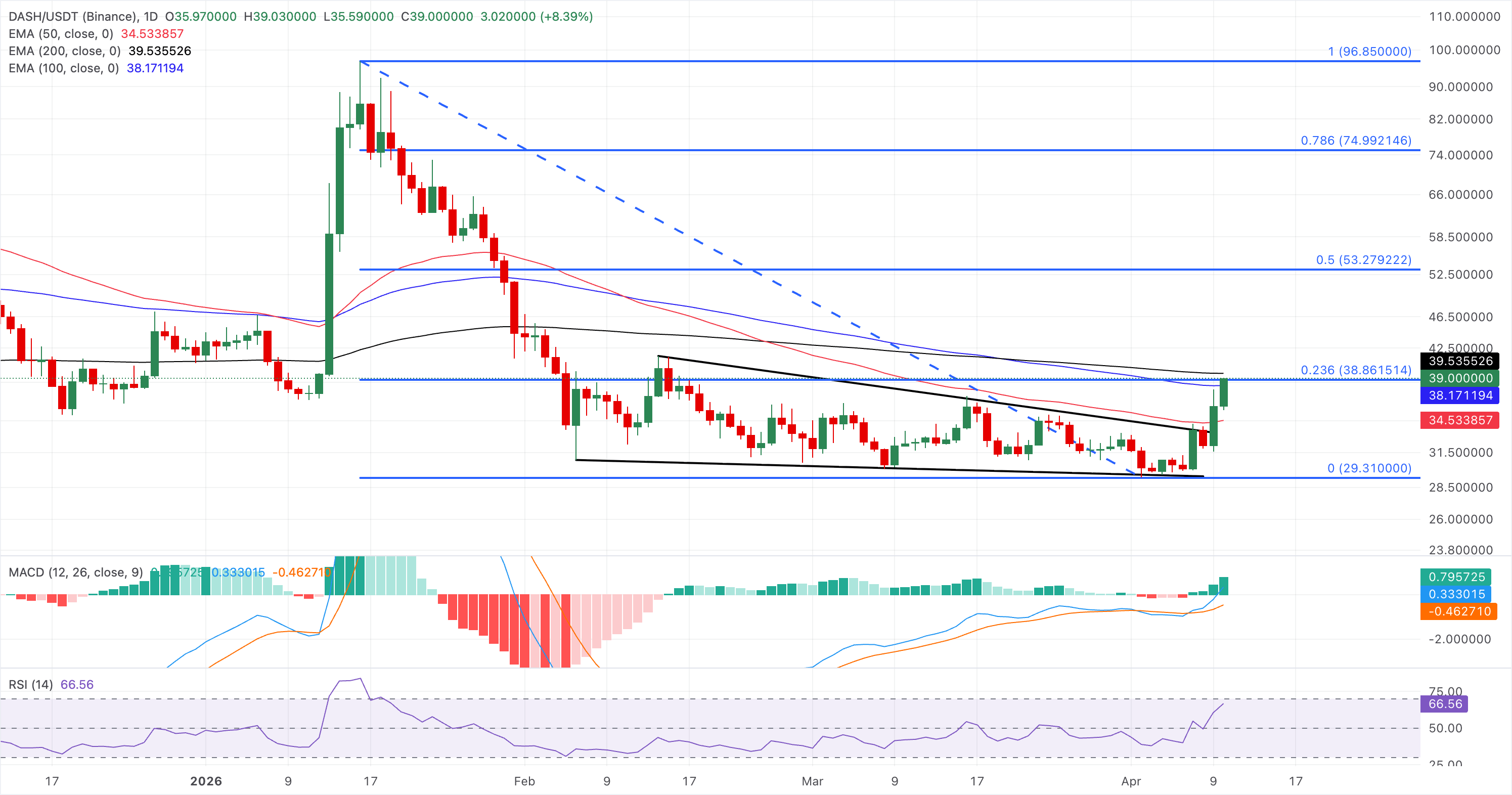 On the other hand, DASH shows a steady recovery toward $40.00, extending a bullish near-term bias as price holds above the 50-day and 100-day EMAs at $34.53 and $38.17, respectively, while challenging the broader downtrend structure.