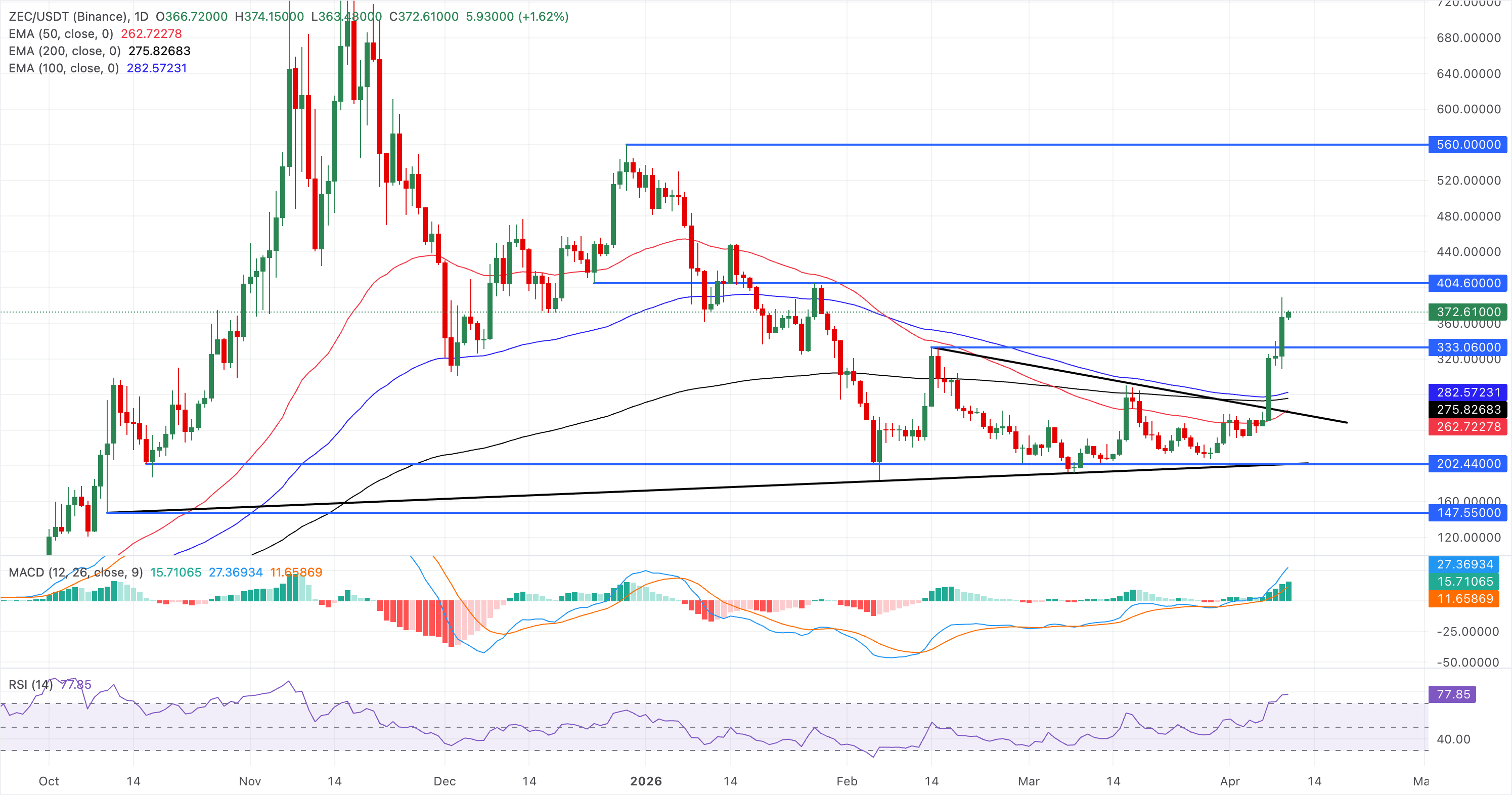 Zcash trades around $375, extending a strong bullish phase after reclaiming and accelerating well above its 50-, 100-, and 200-day EMAs, which now sit comfortably below price, reinforcing an underlying uptrend.