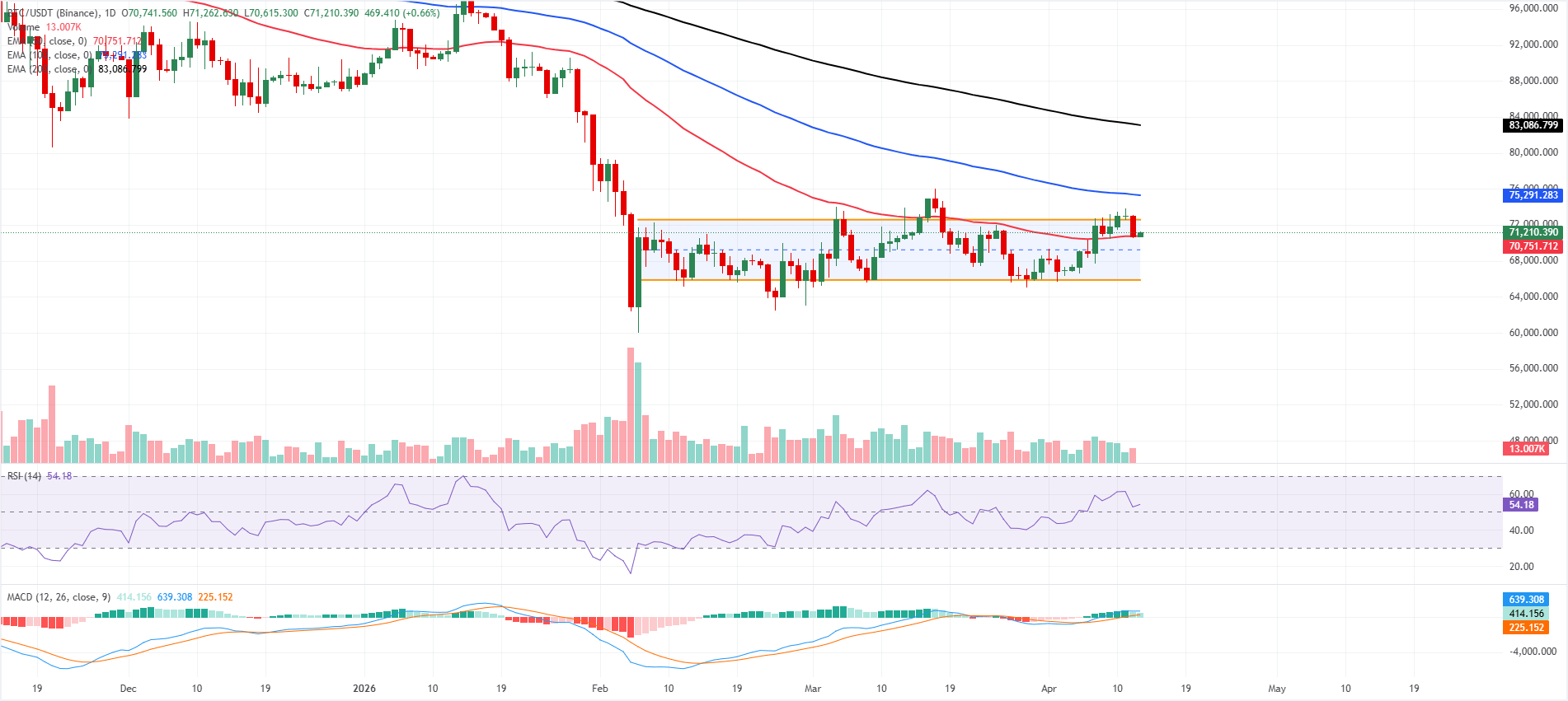 Bitcoin price is trading at $71,210 on Monday, holding just above the 50-day EMA at $70,752 while remaining capped within a parallel channel. The channel’s structure still weighs on the broader outlook, but price action above the short-term EMA hints at a tentative constructive bias.