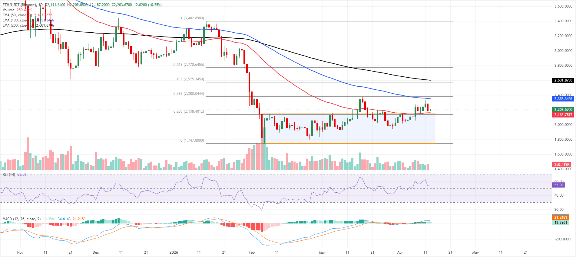 Ethereum price is trading at $2,203 on Monday, with a mildly bullish near-term bias, holding above the 50-day Exponential Moving Average (EMA) at $2,163 and the 23.6% Fibonacci retracement at $2,138.