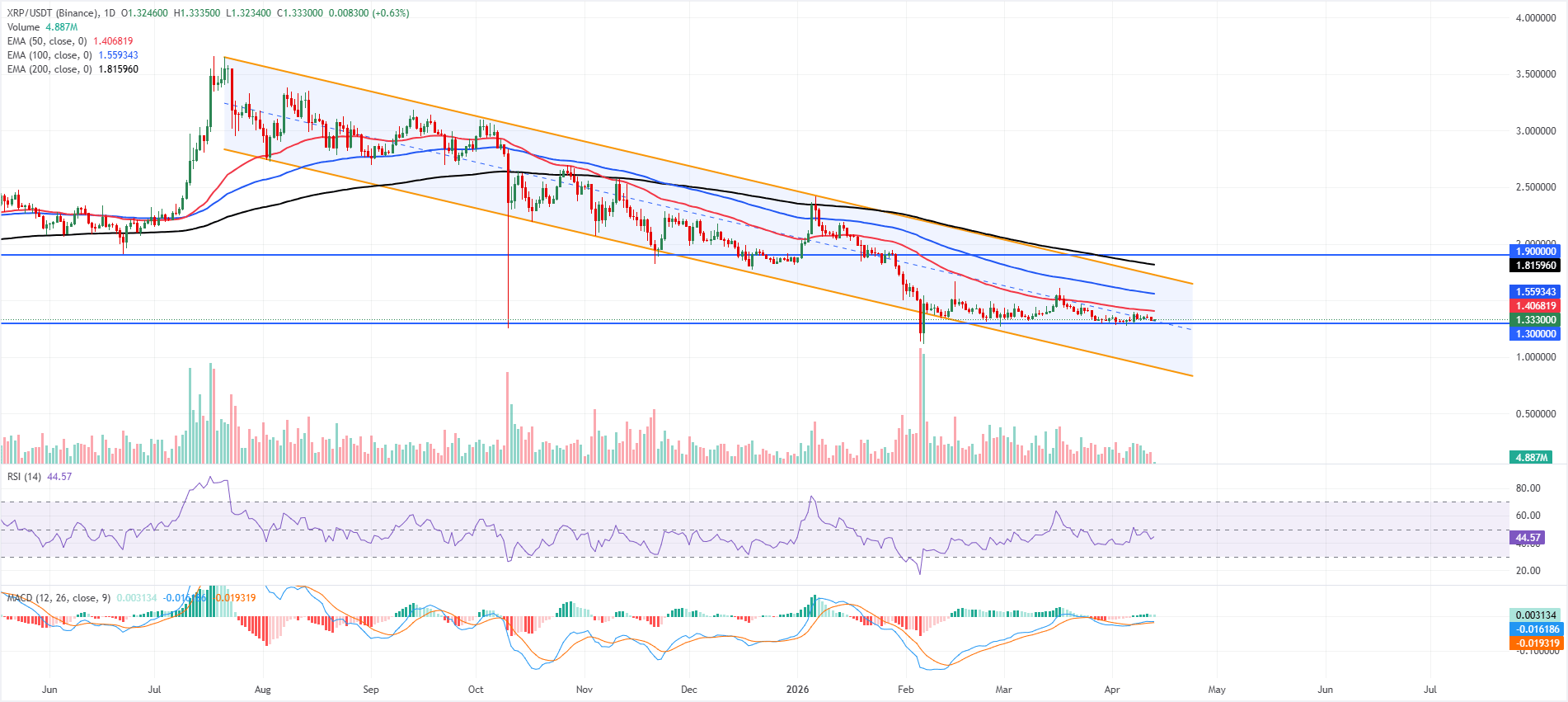 XRP price is trading at $1.33 on Monday, maintaining a bearish bias as it holds below the 50-day, 100-day, and 200-day EMAs at $1.41, $1.56, and $1.82, respectively, all of which act as overhead supply within a broader downward channel.
