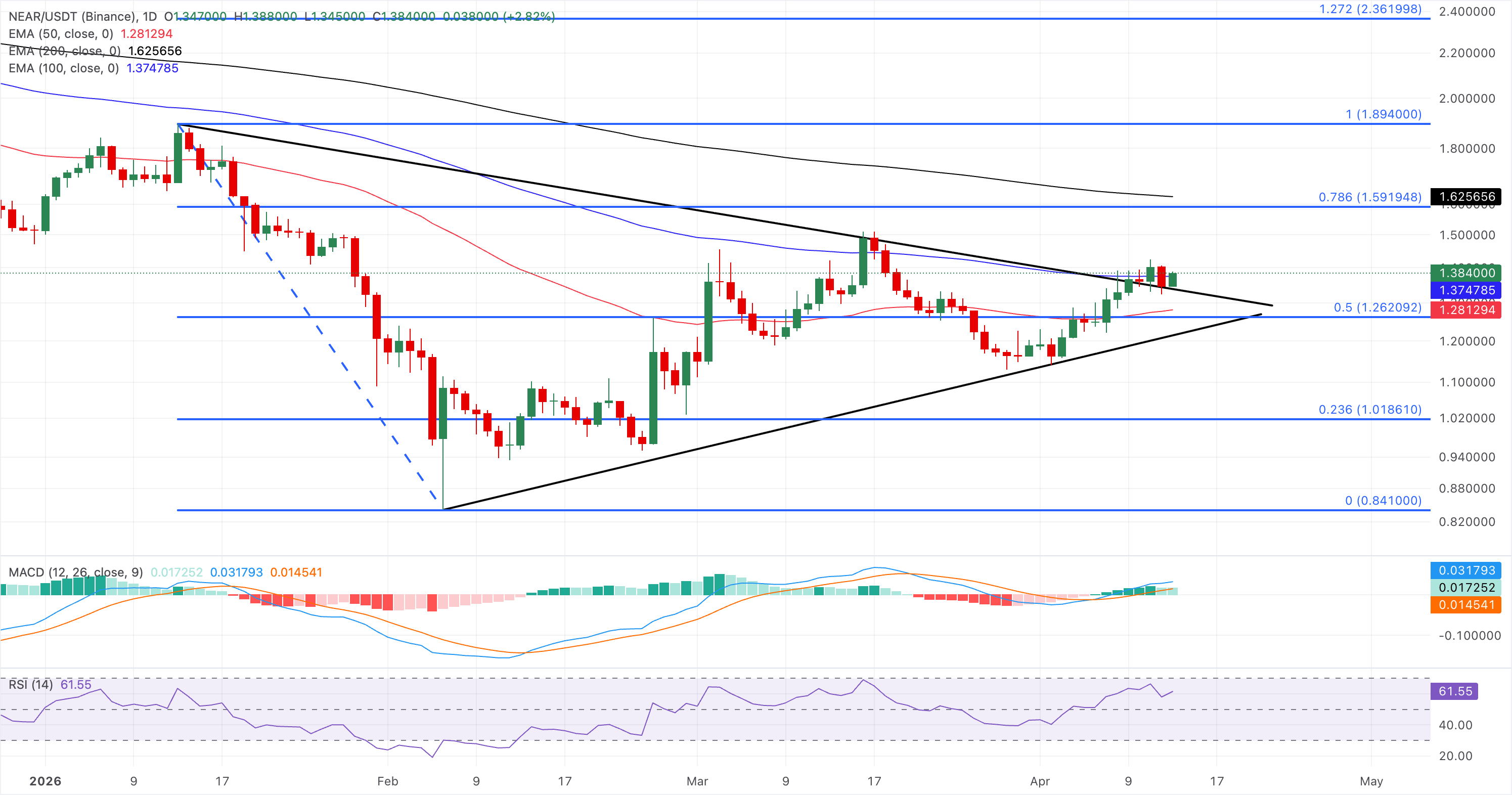 Meanwhile, Near Protocol keeps a constructive short-term bias as price holds above the 50-day and 100-day EMAs at $1.2813 and $1.3748, respectively, and has already reclaimed the former downtrend break around $1.3470.