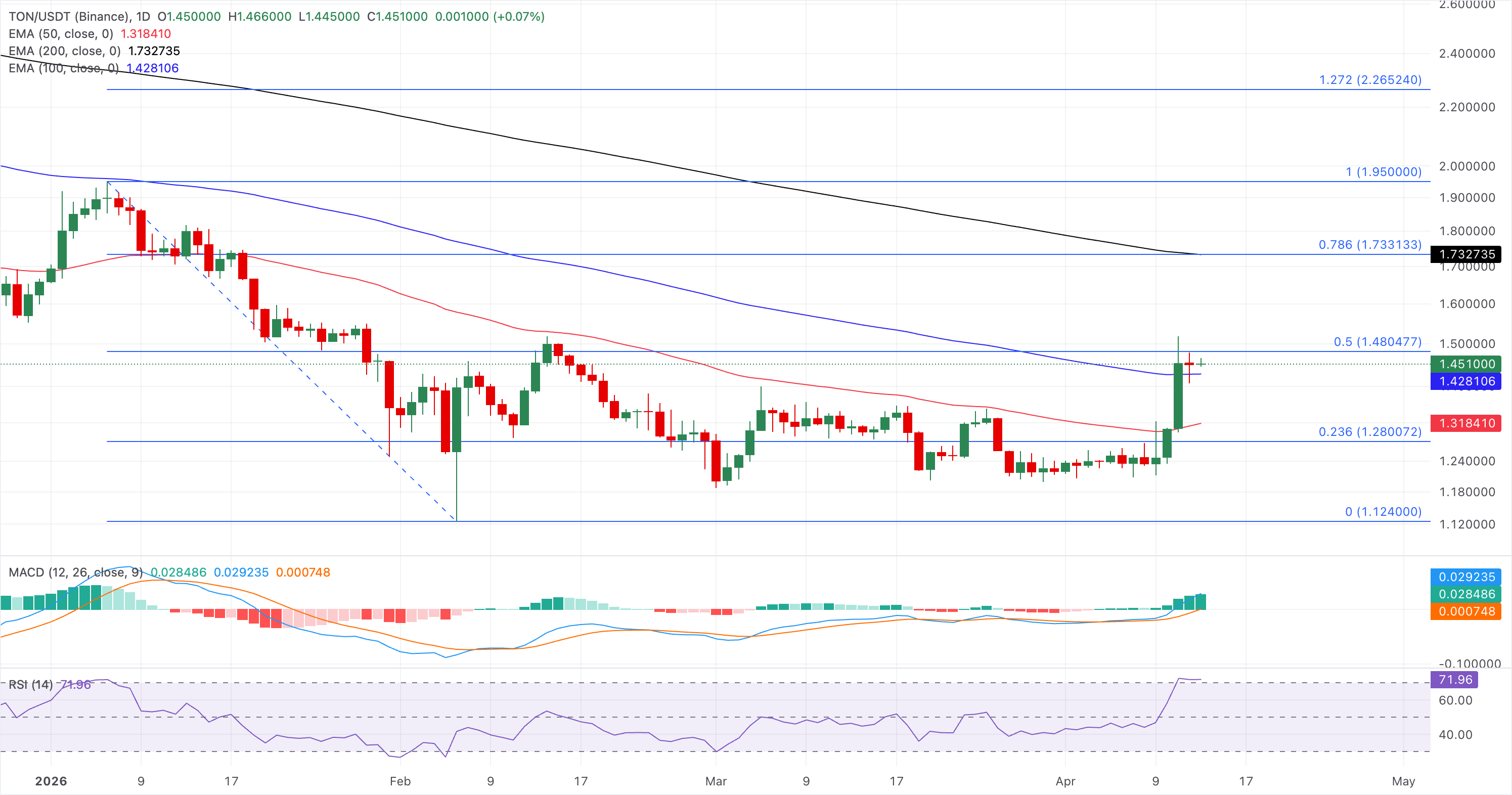 Toncoin extends its rebound above the 100-day EMA at $1.4281, while testing the 50% retracement at $1.4804, maintaining a constructive near-term bias. A decisive close above this level could test the 61.8% retracement near $1.6345.
