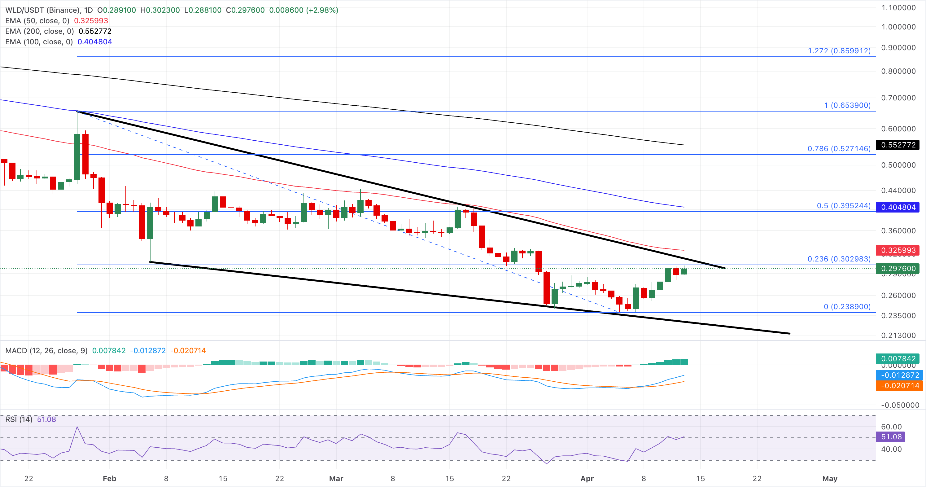 Worldcoin is holding in a broadly bearish configuration as it remains under 50-, 100-, and 200-day EMAs within a broader descending wedge pattern.