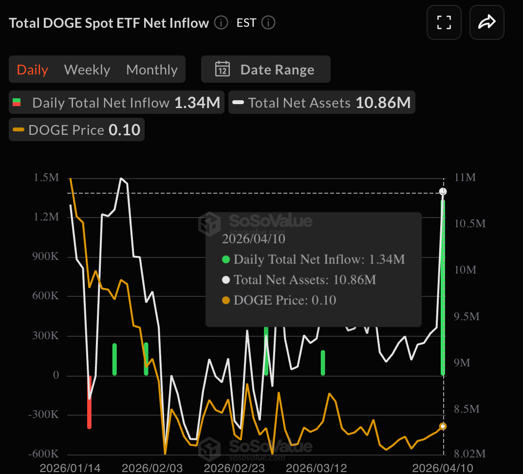 Sentiment toward Dogecoin is mixed amid the ongoing US-Iran conflict over control of the Strait of Hormuz. The DOGE-focused Exchange Traded Funds (ETFs) recorded $1.34 million in inflows on Friday, marking their largest inflow ever after 18 consecutive days of zero net flows. This sudden revival of institutional interest marks its fifth daily inflow since inception and solidifies near-term confidence.