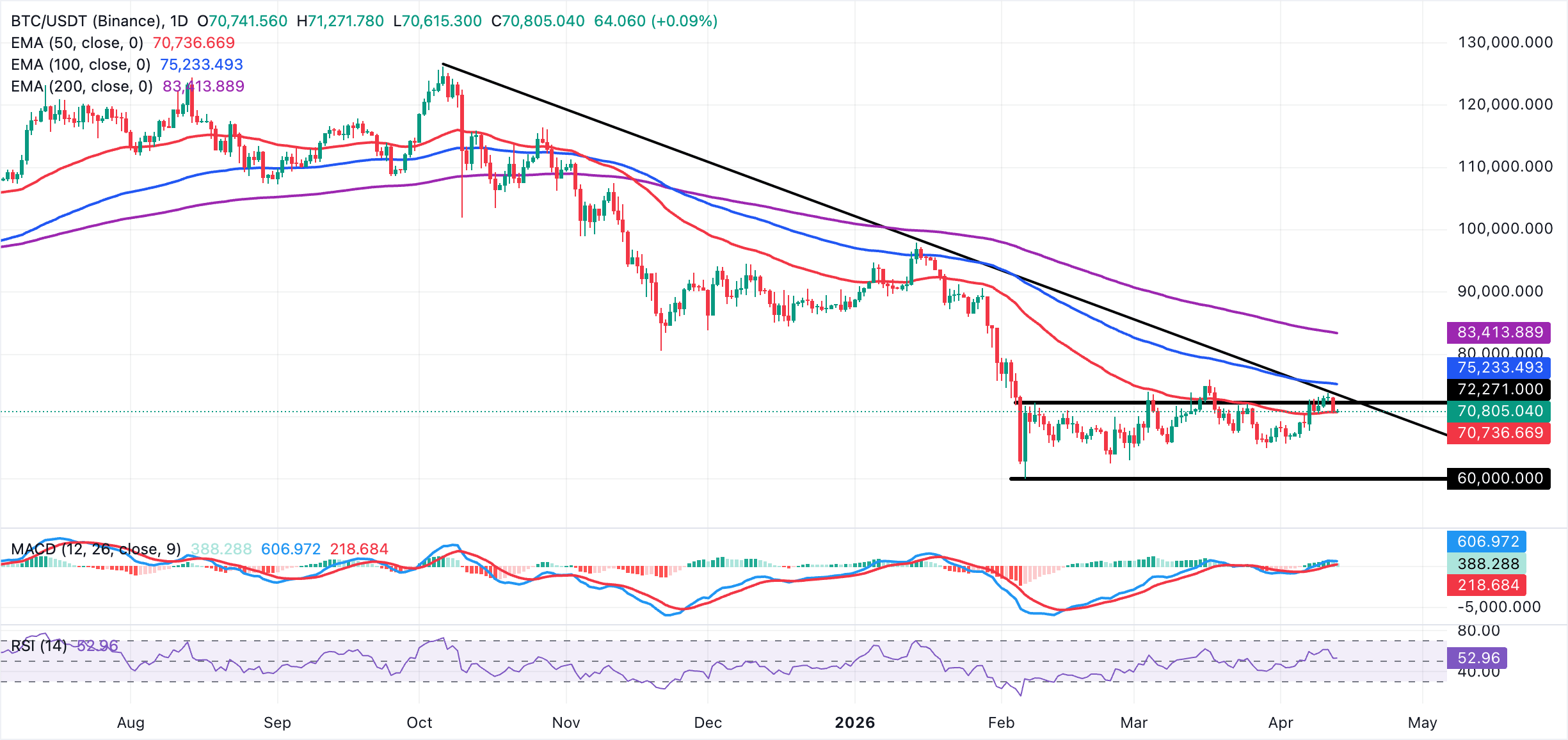 On the topside, immediate resistance emerges at the former downward-trendline break area around $73,448, with the 100-day EMA following higher at $75,233 and the 200-day EMA much further up toward $83,414, collectively forming a broader supply band on advances. On the downside, the primary support is the 50-day EMA at $70,737. A daily close below that level would weaken the current constructive outlook and expose BTC to deeper corrective pressure.