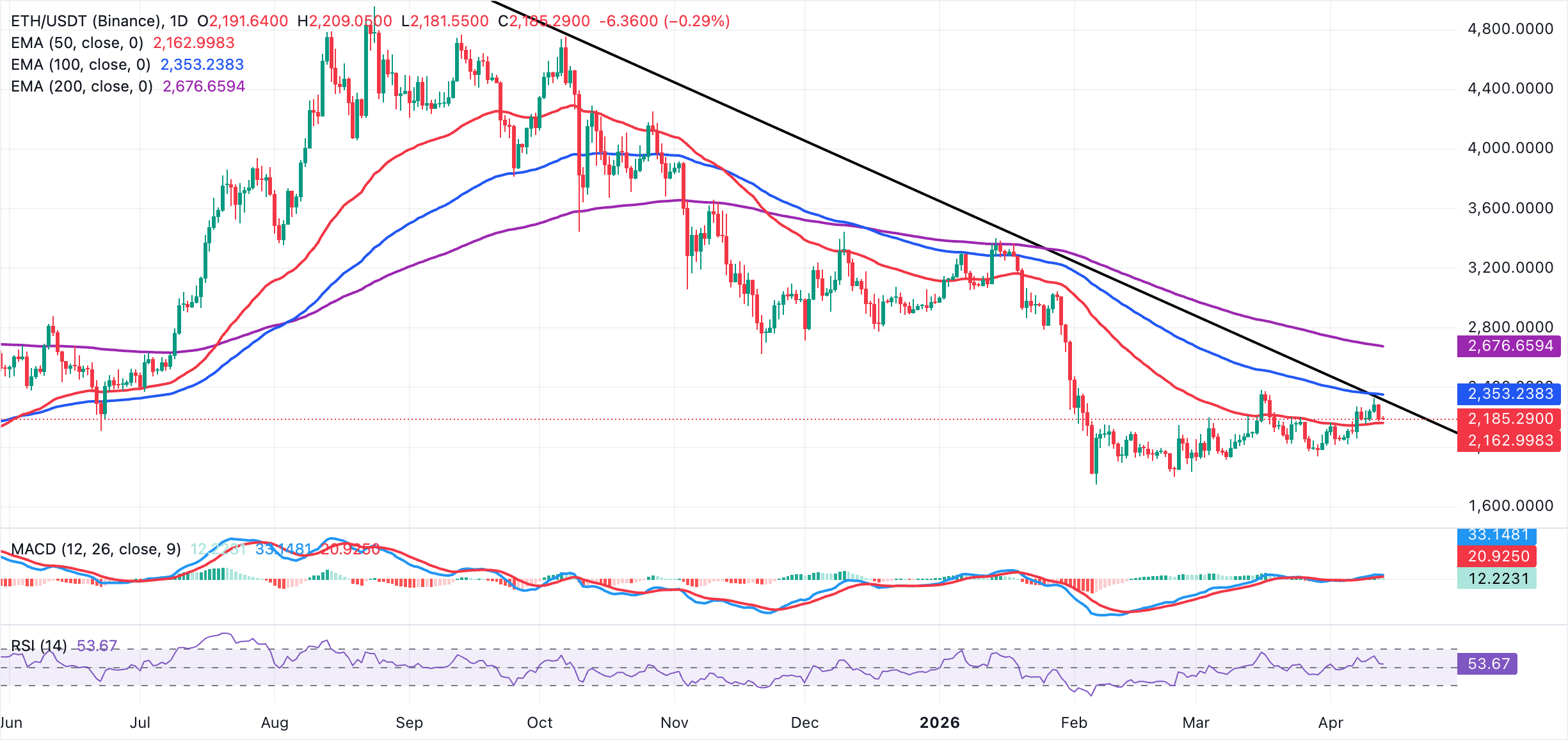 Ethereum trades at $2,185, keeping a corrective-to-bearish near-term bias as it holds under the 100-day and 200-day EMAs at roughly $2,353 and $2,677, respectively. The price remains marginally above the 50-day EMA at $2,163, which offers initial dynamic support. At the same time, the long-standing downward resistance trend line, with a break level near $2,314, continues to cap the topside.