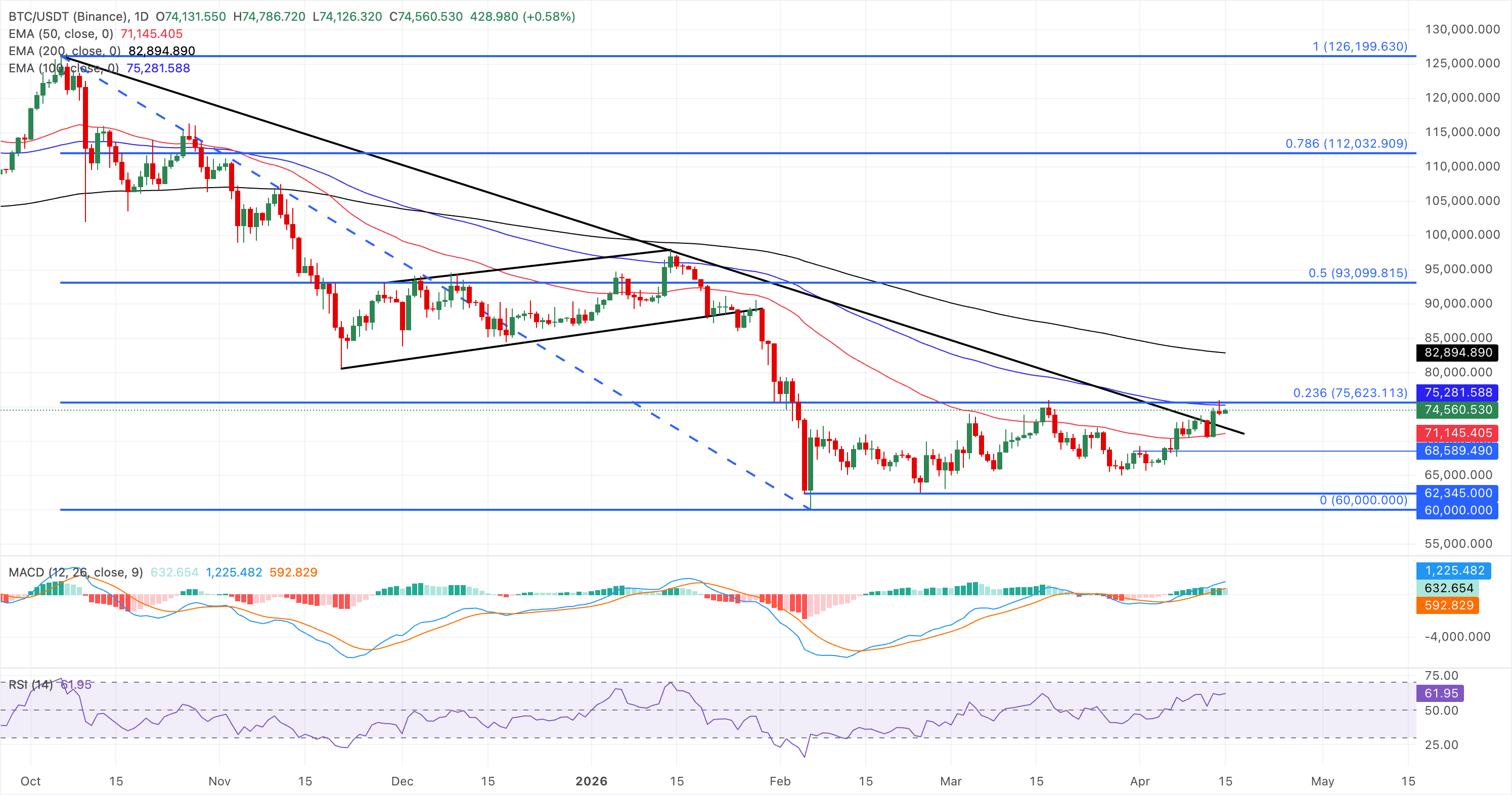 On the downside, initial support is provided by the 50-day EMA at $71,133, ahead of the rising trend-line support from prior cycle highs. Meanwhile, a deeper pullback toward the structural floor around the $60,000 Fibonacci anchor.