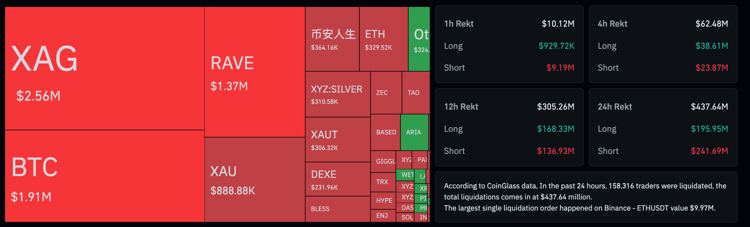The cryptocurrency market remains volatile amid the ongoing US-Iran ceasefire talks, reflecting persistent pressure. CoinGlass data shows $437 million in total liquidations over the last 24 hours, driven by $241 million in short liquidations and $195 million in long liquidations.
