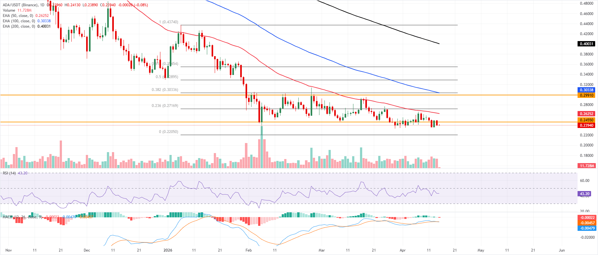 Cardano is trading at $0.239 on Wednesday, maintaining a bearish near-term bias as it holds well below the 50-day, 100-day, and 200-day Exponential Moving Averages (EMAs). ADA remains capped first by the nearby horizontal barrier at $0.245, with the 50-day EMA at $0.262 and the 23.6% Fibonacci retracement of the latest downswing at $0.271 layering additional overhead supply.