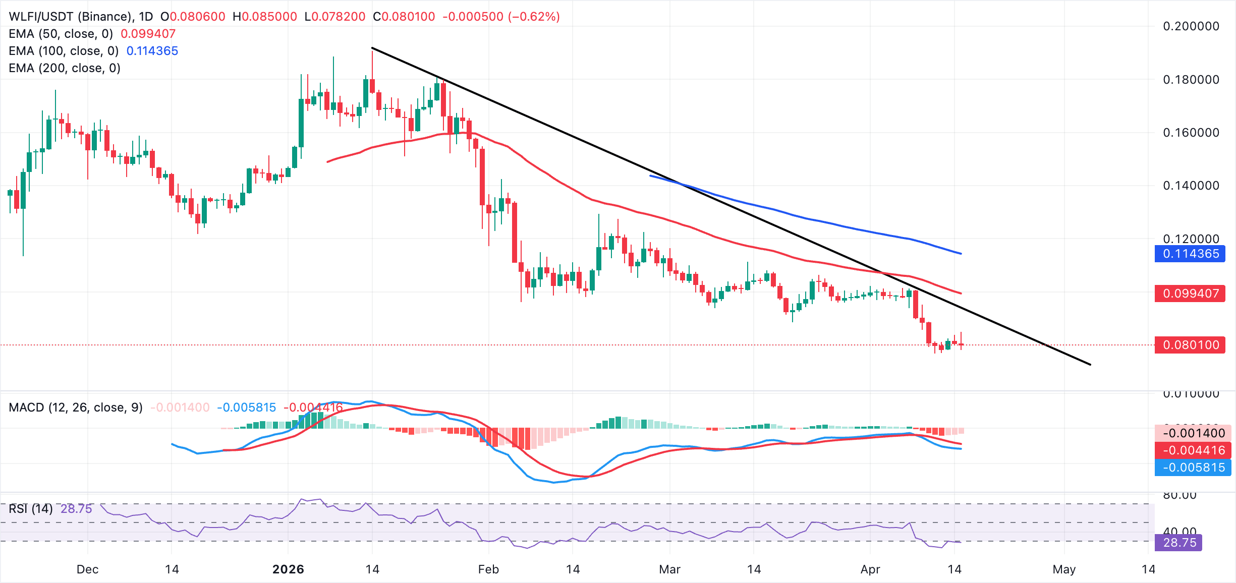 World Liberty Financial token (WLFI) is trading around $0.08 at the time of writing on Wednesday, in line with relatively suppressed sentiment across the crypto market. The Decentralized Finance (DeFi) token trades within a broader downtrend from a record high of $0.33 in September. Weak technicals frequently dampen recovery attempts, leaving WLFI vulnerable to overall crypto market volatility.
