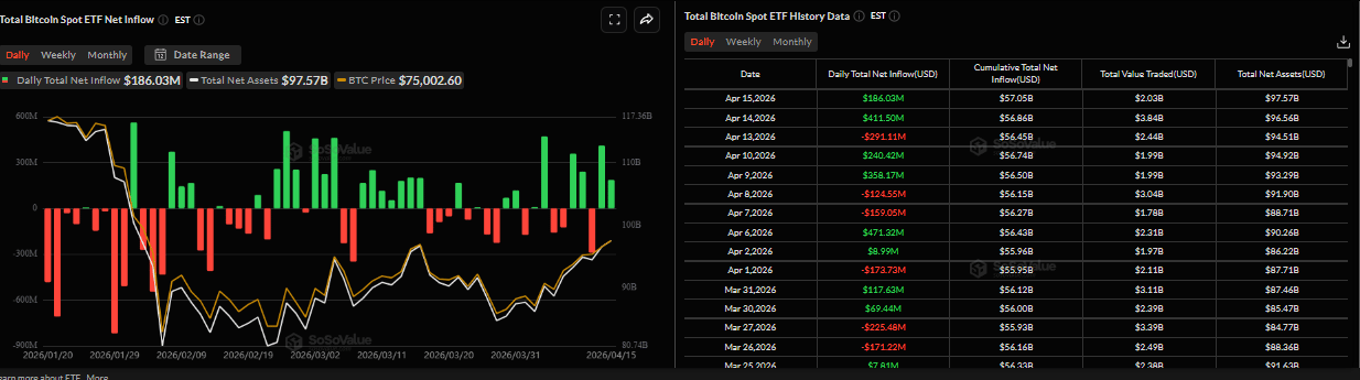 Institutional demand shows early signs of return amid the possibility of a two-week extension of the ceasefire. SoSoVaue data shows that Bitcoin spot ETFs recorded inflows of $186.03 million on Wednesday, marking the second consecutive inflow this week. If this inflow continues throughout the week, Bitcoin could see an upward move.