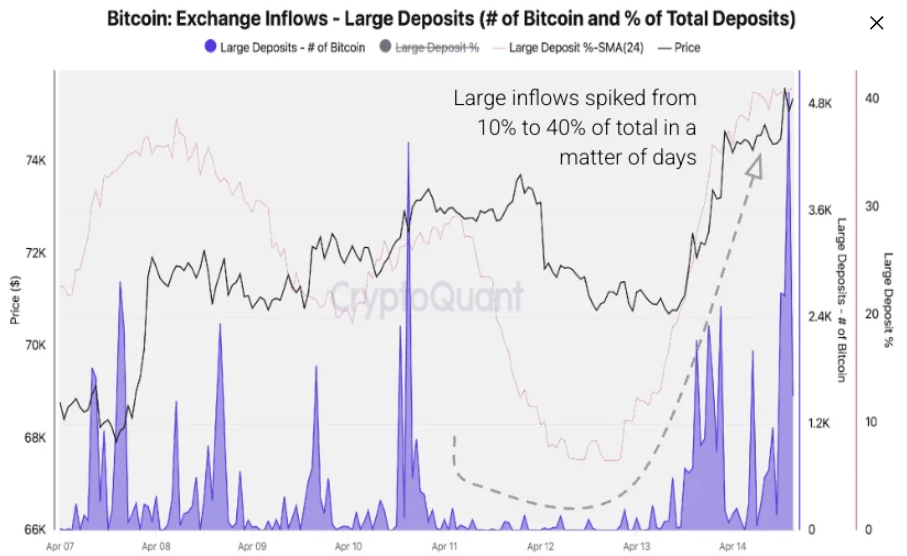 Bitcoin Exchange inflows-large deposits chart. Source: CryptoQuant