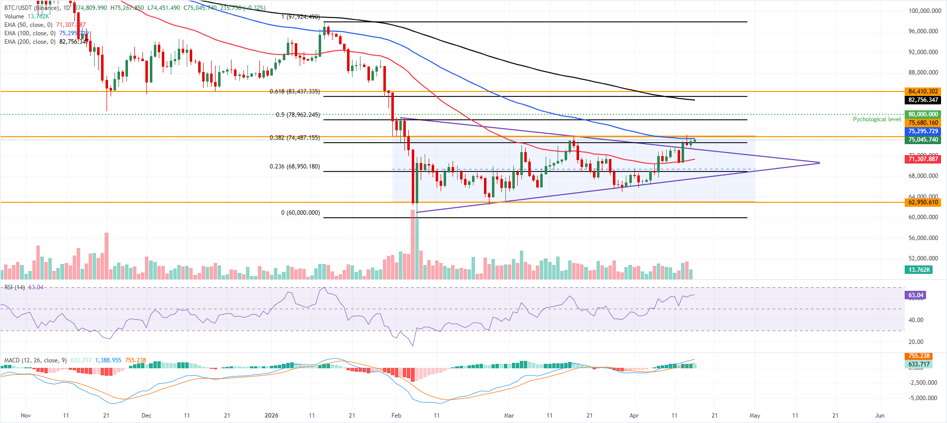 Bitcoin is trading above $75,000 on Thursday, nearing a key resistance around the 100-day Exponential Moving Average (EMA) near $75,300. BTC has retested and found support around the previously broken upper boundary of an ascending triangle pattern (drawn by connecting highs and lows with two trendlines since early February) near $73,400 on Wednesday.