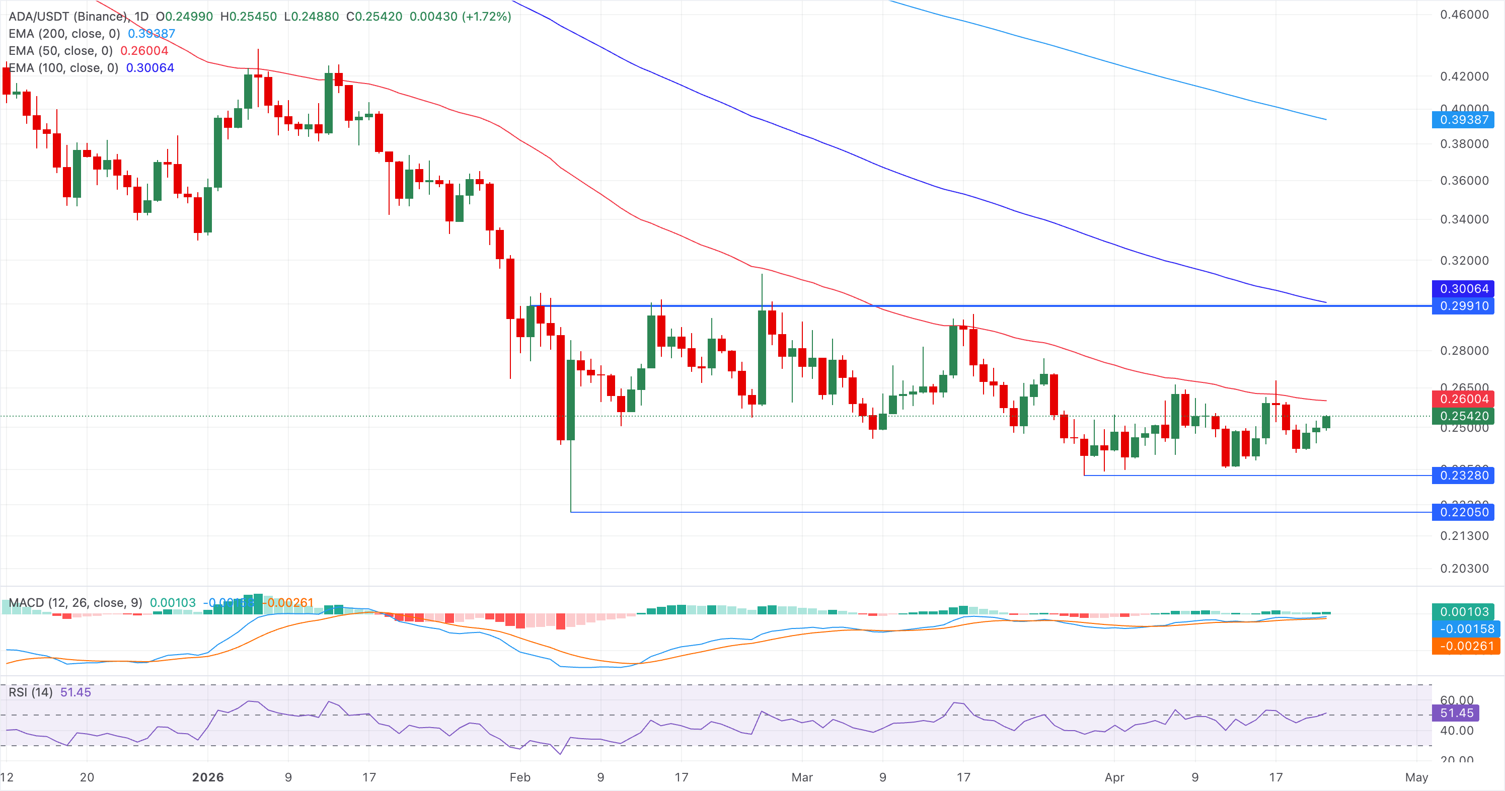 Cardano extends its recovery above $0.2500 at press time on Wednesday, amid a broader bearish bias, as the 50-day Exponential Moving Average (EMA) at $0.2600 caps upside attempts. Meanwhile, the 100-day and 200-day EMAs at $0.3009 and $0.3953, respectively, serve as overhead resistances.