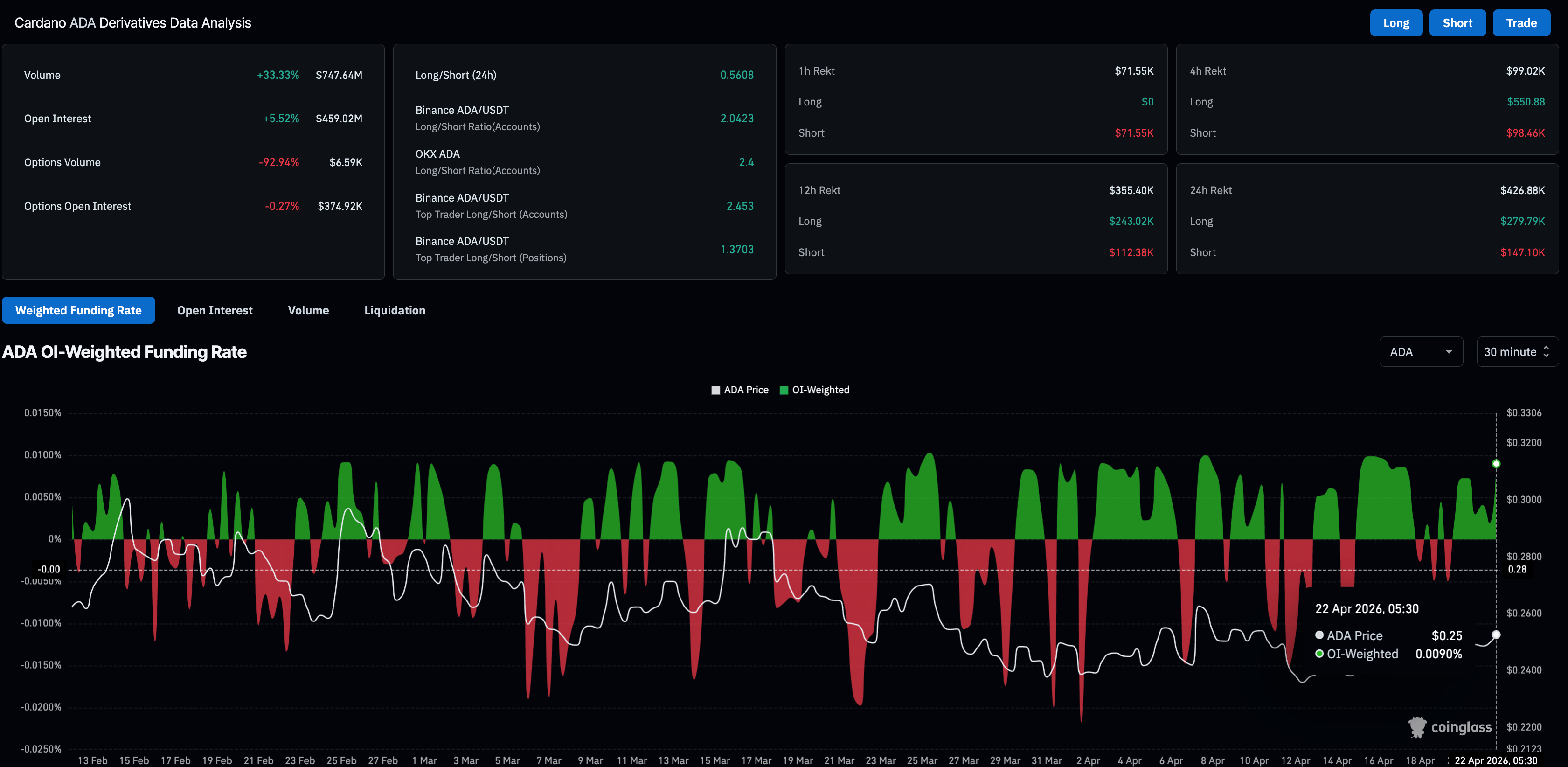 Cardano is gradually gaining retail strength as the broader cryptocurrency market holds a largely recovering tone amid the resurfacing US-Iran tensions. CoinGlass data shows the ADA futures Open Interest (OI) is up over 5% in the last 24 hours to $459.02 million, suggesting increased retail activity amid anticipation of sharp moves. The positive funding rate of 0.0090% reveals a bullish undertone in the positional buildup as buyers are willing to hold long positions at a premium.