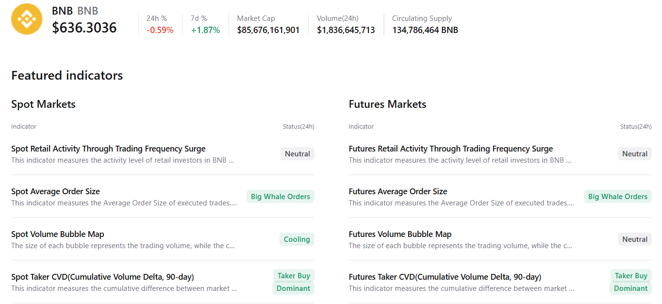 CryptoQuant summary data suggests a bullish outlook for BNB. Spot and futures markets show the presence of large whale orders and buy-side dominance, suggesting a potential upside move.