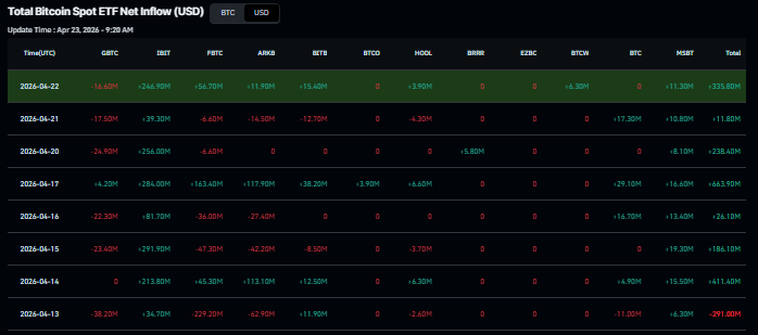 Institutional demand for Bitcoin has continued to support its price rise so far this week. CoinGlass data showed that spot Bitcoin Exchange Traded Funds (ETFs) recorded inflows of $335.80 million on Wednesday, marking seven consecutive days of positive flows since April 13. If these inflows continue and intensify, BTC could see a further rally ahead.