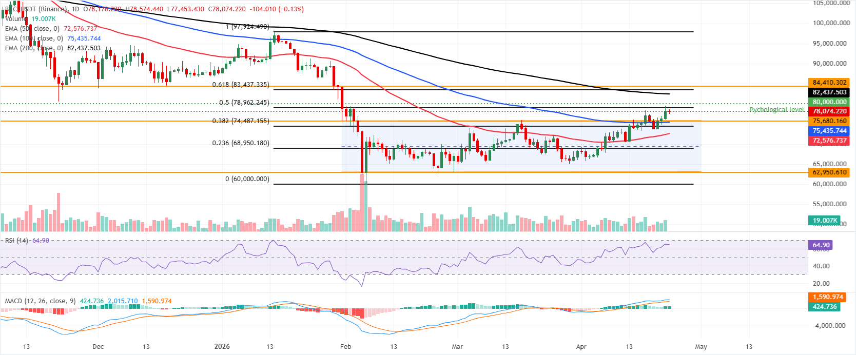 Bitcoin is maintaining a constructive bullish bias as it holds well above the 50-day and 100-day Exponential Moving Averages (EMAs) at $72,576 and $75,435, respectively. Price is also stretching away from the upper boundary of the horizontal parallel channel around $75,680, hinting at persistent upside pressure after the recent breakout.