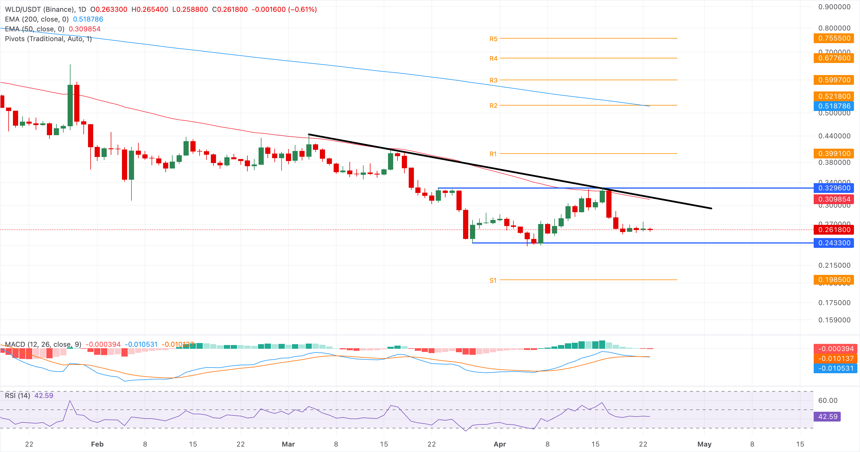 On the flip side, the March 28 low at $0.2433 remains a crucial support, followed by the S1 Pivot Point at $0.1985.