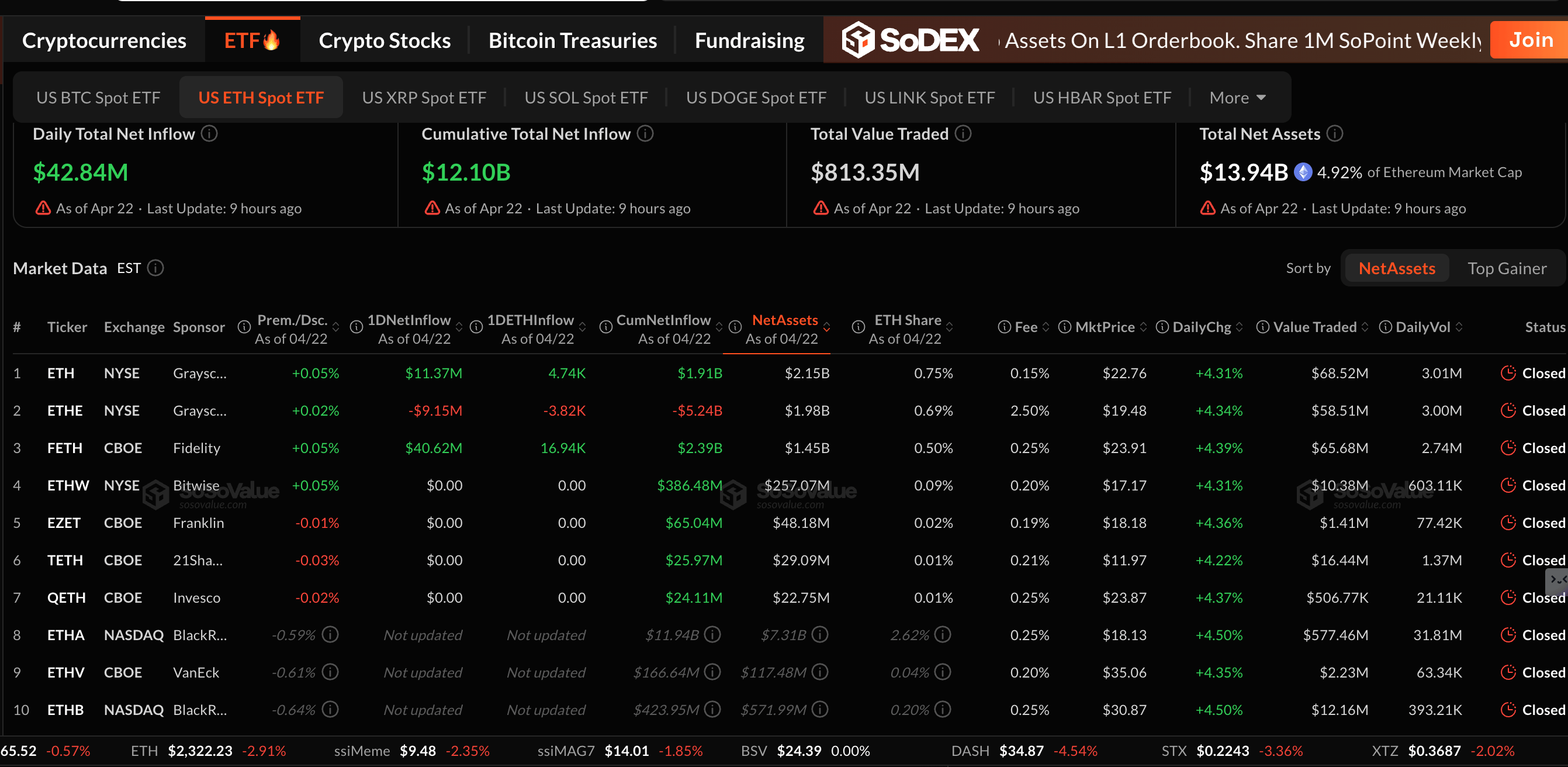 Ethereum is also experiencing an influx of capital via spot ETFs, as reflected by inflows of nearly $43 million on Wednesday. SoSoValue data shows the cumulative inflows averaging $12.10 billion, while net assets stand at $13.94 billion.