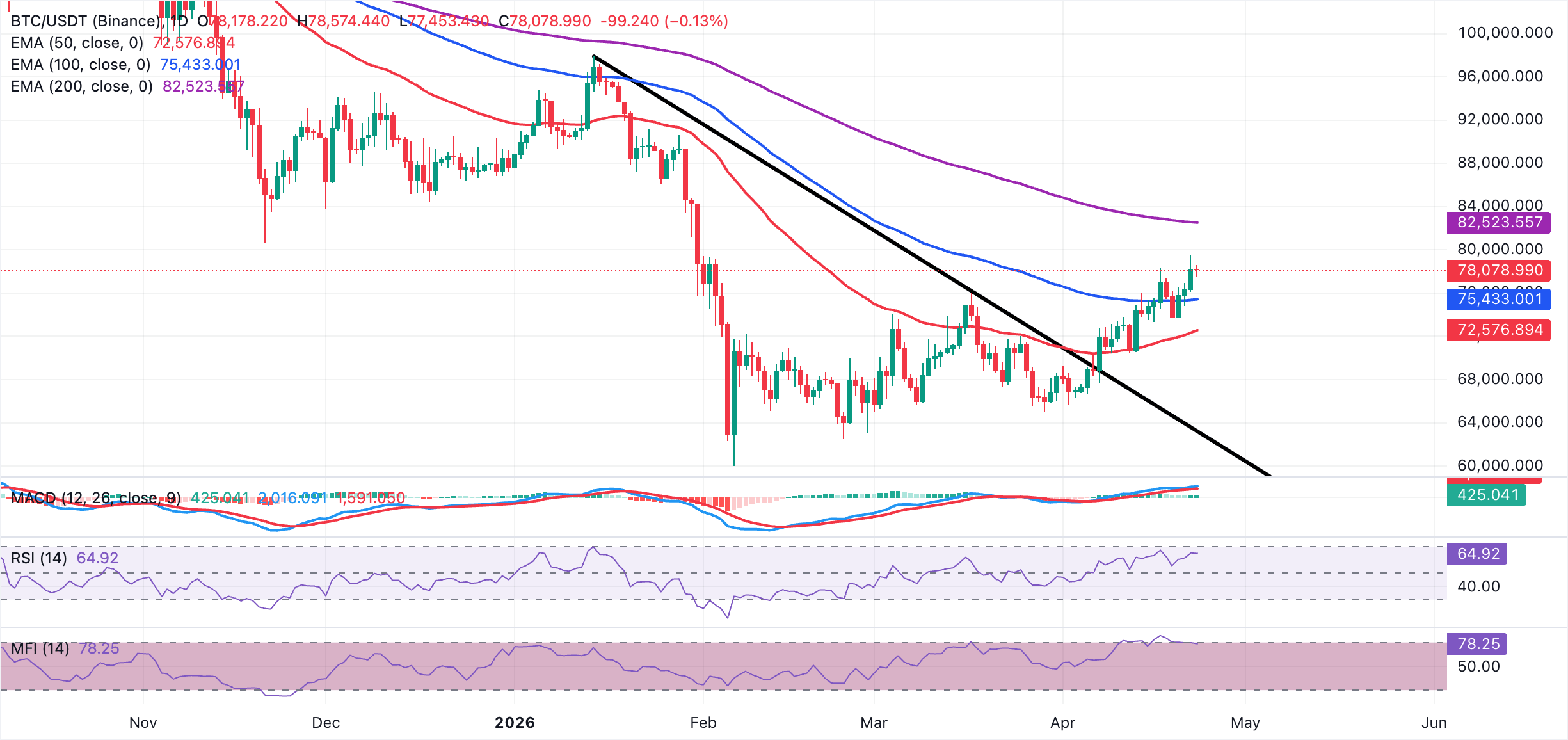 On the topside, the next notable resistance is the weekly peak of $79,473, followed by the 200-day EMA near $82,524, which aligns as the first major trend hurdle for bulls. On the downside, initial support is seen at the 100-day EMA around $75,433, ahead of the 50-day EMA near $72,577. A daily close below these layers would signal fading bullish control and open the door to a deeper corrective phase.