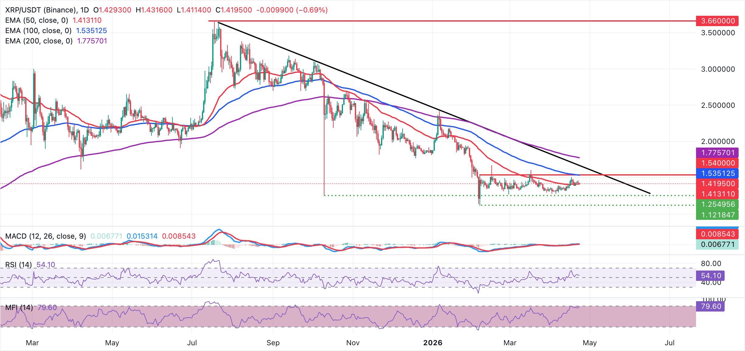 On the topside, initial resistance lies at the weekly peak of $1.46, followed by the 100-day EMA around $1.54, which guards the path toward the more strategic 200-day EMA at $1.78. On the downside, immediate support is provided by the 50-day EMA at $1.41. A sustained break below this floor would expose XRP to a deeper corrective phase.