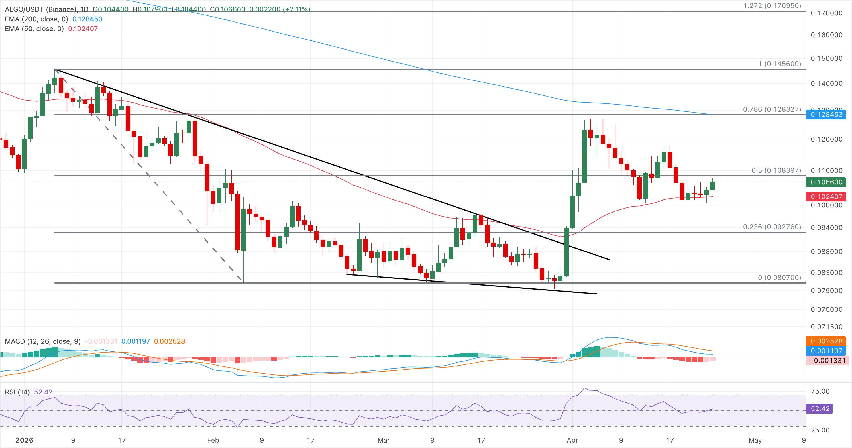 However, the broader structure remains capped while ALGO trades well beneath the 200-day EMA at $0.1285 and under the descending resistance trend line, keeping recovery attempts corrective within a still-dominant higher-timeframe downtrend. The RSI at 52 signals balanced momentum after exiting oversold territory, while the negative MACD histogram suggests bullish momentum is tentative.