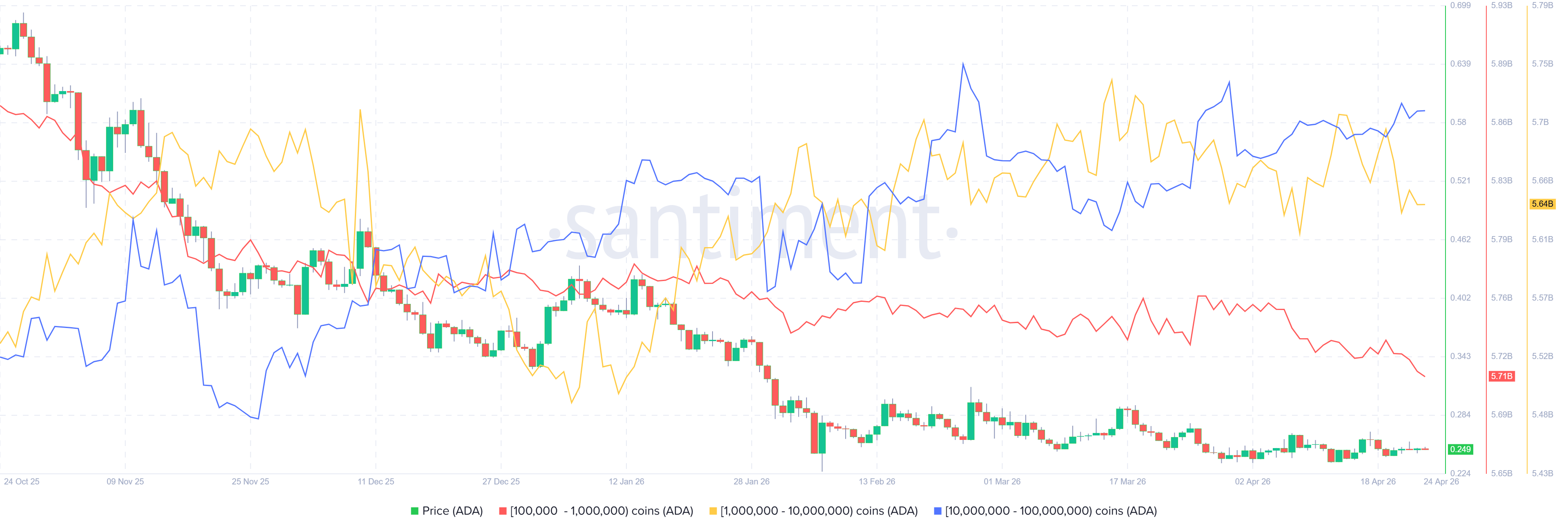 The metric indicates that whales holding between 100,000 and 1 million (red line) and 1 million and 10 million (yellow line) ADA tokens have shed 80 million tokens since April 19.