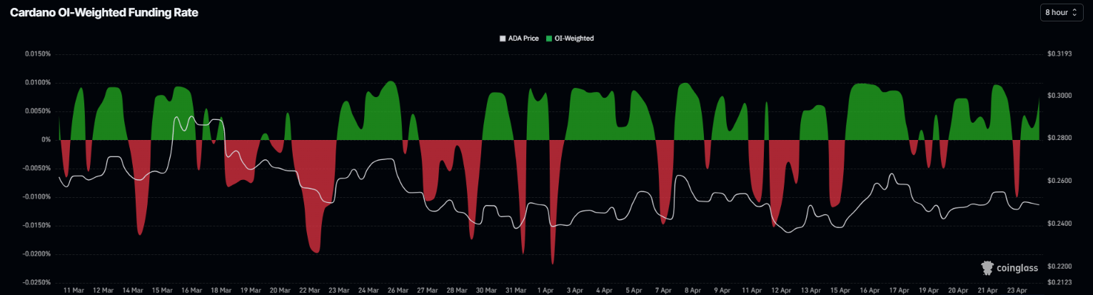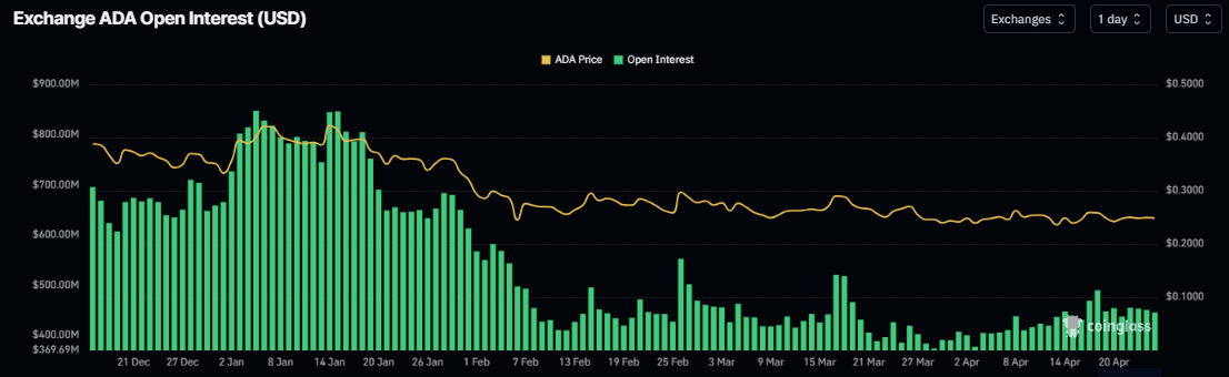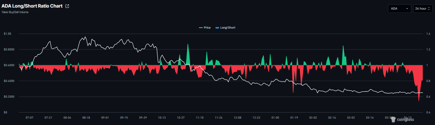 Cardano’s derivatives data shows mixed signals with a slight bearish tilt. CoinGlass’ Open Interest (OI) for ADA drops to $445 million on Friday from $490 million on April 18, and has remained silent since then. This steady drop in OI reflects waning investor participation and projects a bearish outlook.