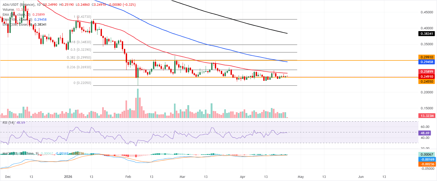 Cardano price is trading below $0.250 on Friday, holding a bearish near-term bias as price remains capped beneath a dense band of Exponential Moving Average (EMA) resistance. The 50-day Exponential Moving Average (EMA) at $0.258 is the first ceiling overhead, followed by the 23.6% Fibonacci retracement at $0.269 and the 100-day EMA at $0.294, collectively reinforcing a topside cap well below the broader resistance cluster around $0.299.