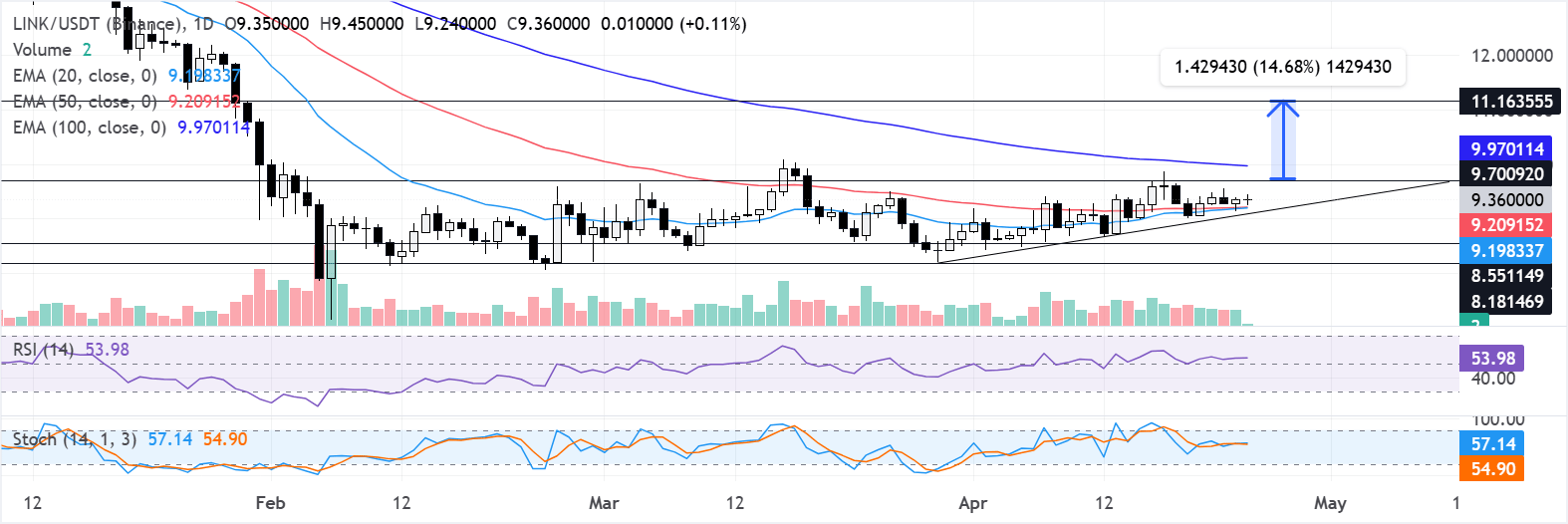 • LINK has found support near the 20- and 50-day EMAs ahead of a key ascending trendline.