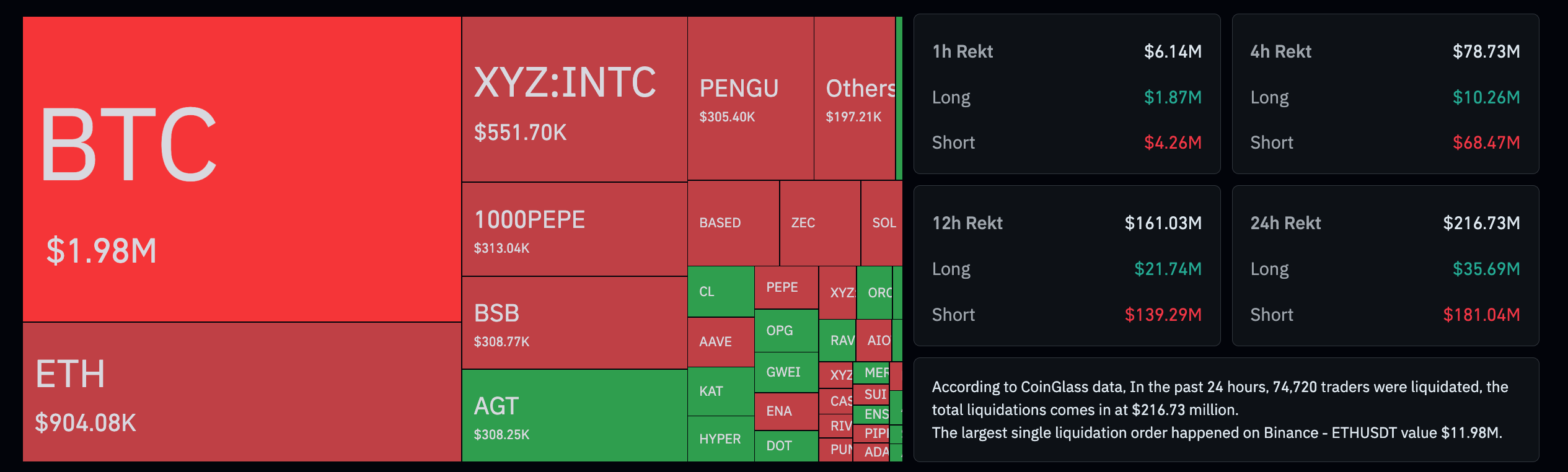 CoinGlass data shows that the Bitcoin, Ethereum (ETH), and Ripple (XRP) futures Open Interest (OI) is up between 4% to 6%, suggesting positional buildup. Meanwhile, $216 million in total liquidations over the last 24 hours, driven by $181 million in short liquidations, suggests a bearish wipeout linked to rising spot prices.