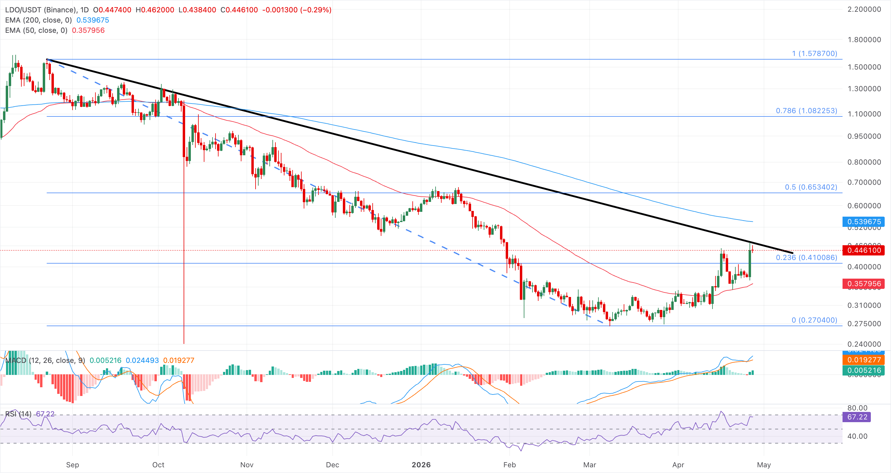Lido DAO extends a constructive rebound above the 50-day EMA at $0.3580, keeping a short-term bullish bias in place. However, LDO struggles near a descending resistance line, challenging the recovery near the $0.5000 psychological mark, while the 200-day EMA at $0.5397 remains a higher structural cap within a broader downtrend.
