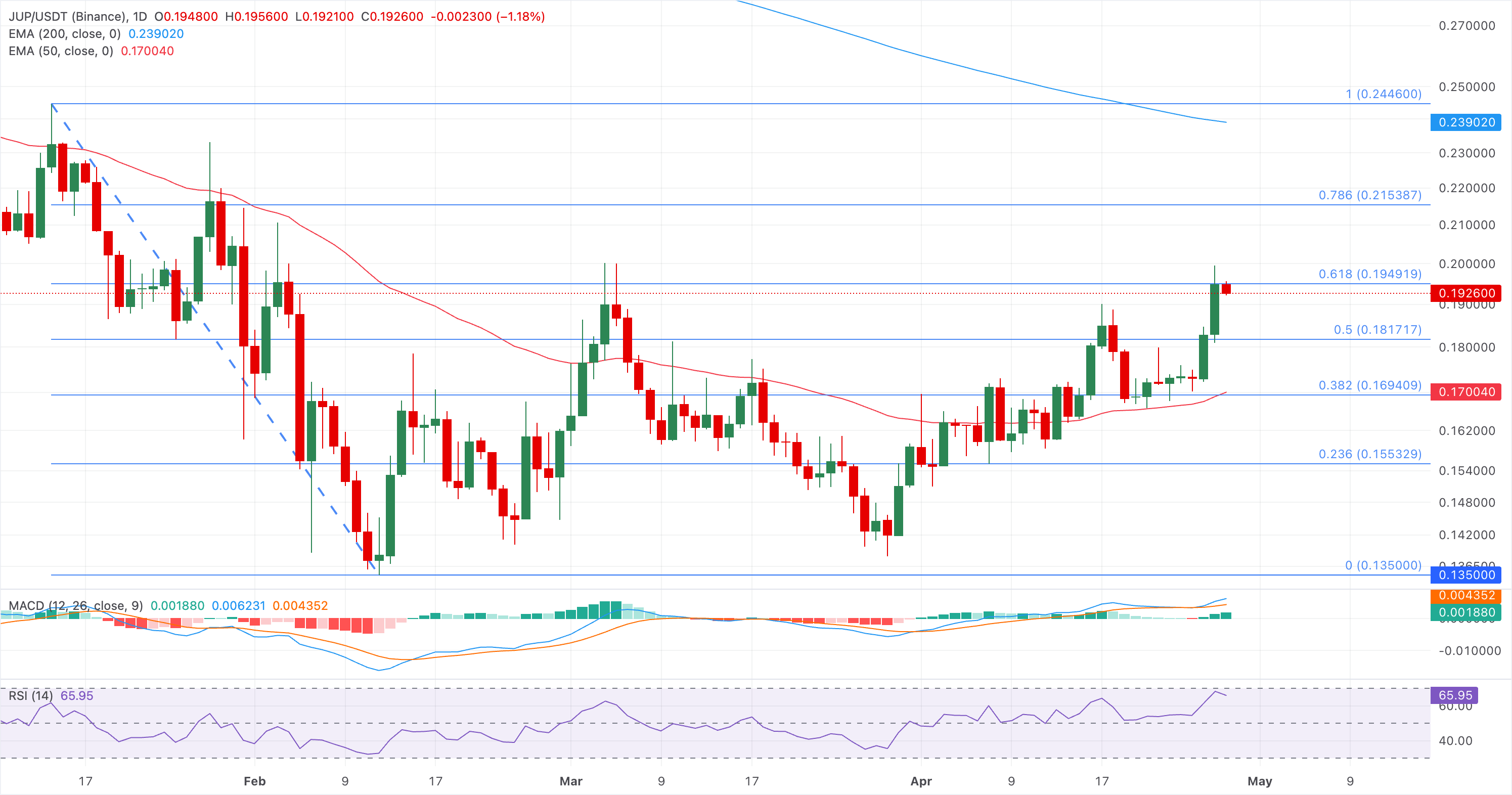 Jupiter edges lower at press time on Tuesday after two consecutive days of roughly 6% gains. The pair maintains a constructive bullish bias as it holds above the 50-day EMA at $0.1700 and has reclaimed the 50% retracement near $0.1817.