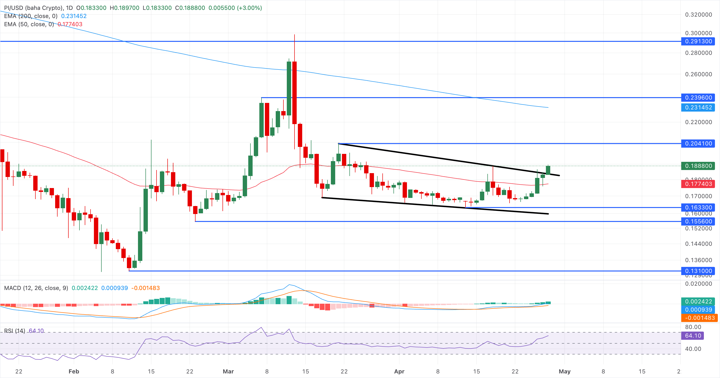 Pi Network shows a constructive near-term bias as it extends gains above $0.1800 at the time of writing on Tuesday. The intraday gains test grounds above the descending trendline around $0.1837, and a decisive close could target the 200-day EMA at $0.2315.