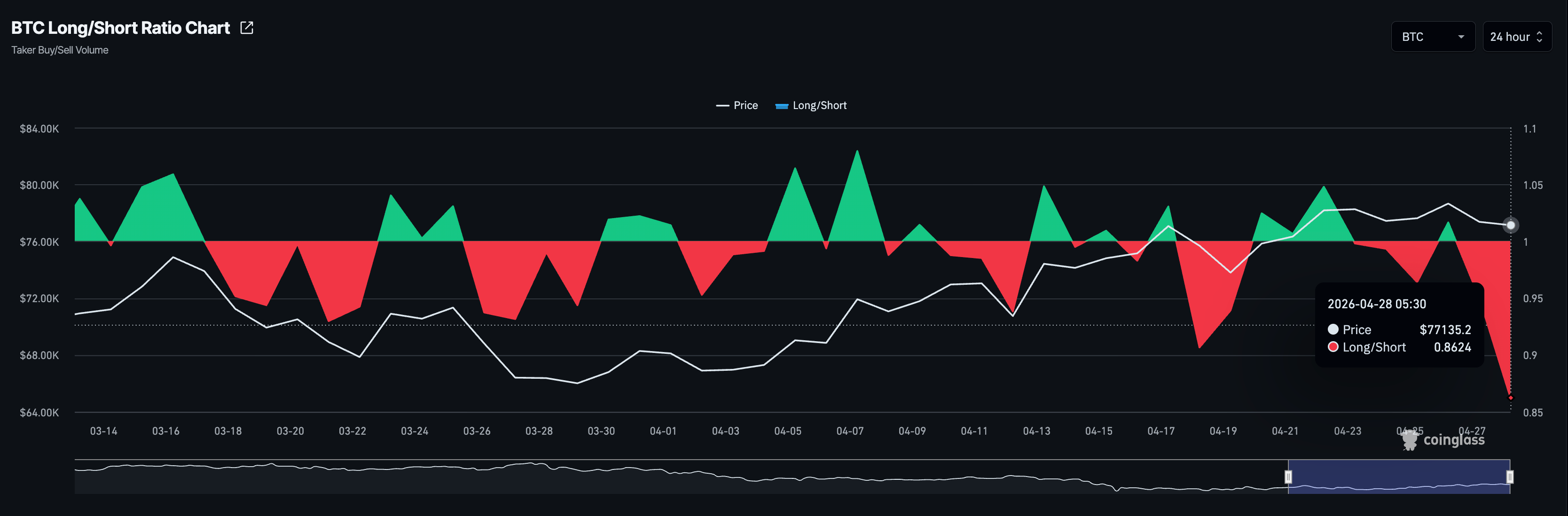 Bitcoin extends losses below $77,000 at press time on Tuesday, risking a pullback toward $75,000. The derivatives market is quick to place bets on this potential downside, leading to leverage-driven downside pressure. CoinGlass data shows the long-to-short ratio is down to 0.8624, suggesting that the active short positions outnumber long positions.