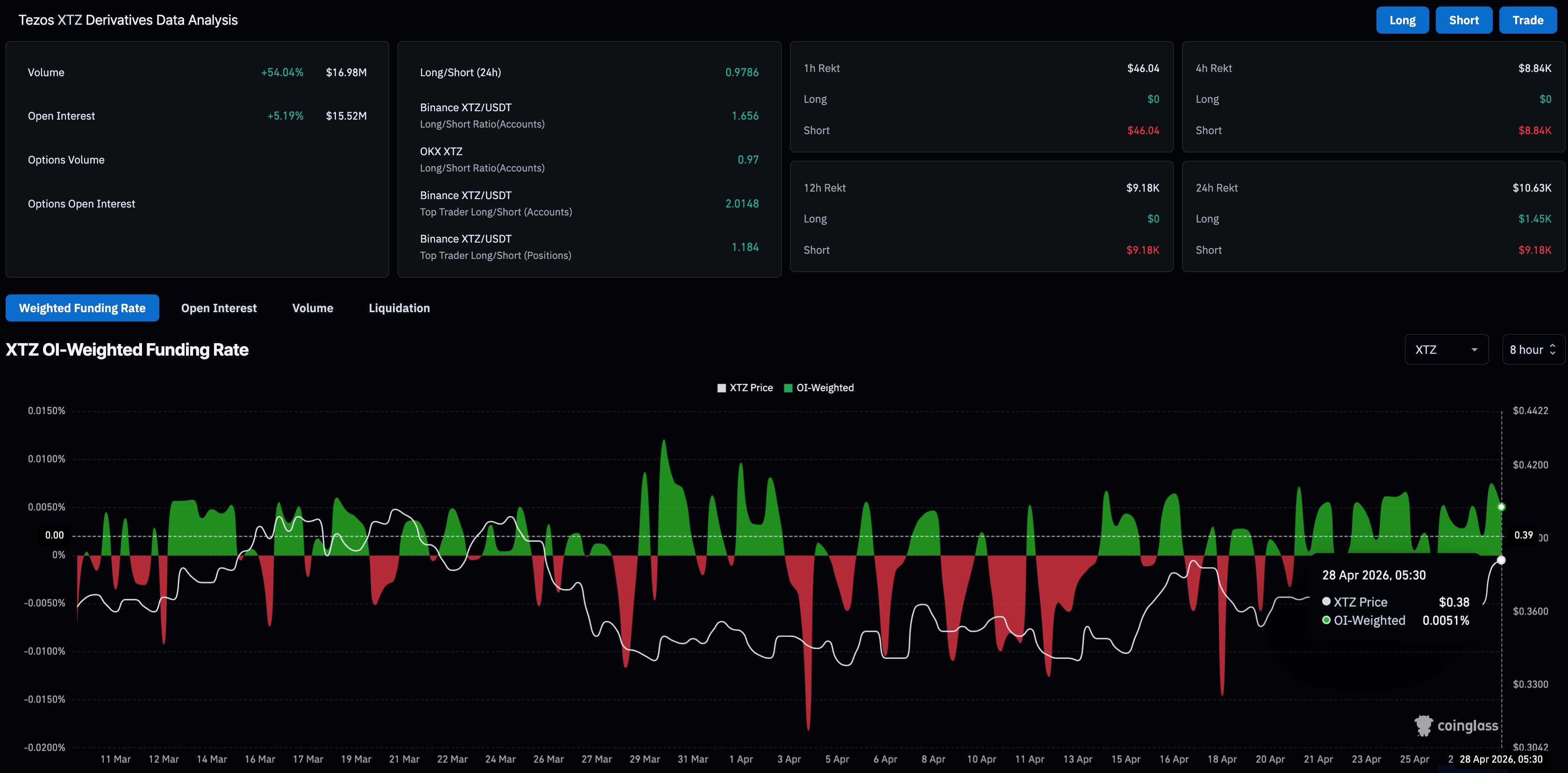 The short-term recovery in Tezos rebuilds retail confidence in the privacy coin, leading to increased leverage-linked trading activity. CoinGlass data shows the XTZ futures Open Interest (OI) is up over 5% in the last 24 hours to $15.52 million, indicating increased positional setup as risk-on sentiment renews among traders.