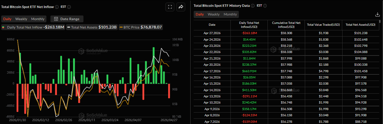 Bitcoin (BTC) extends its losses, trading below $77,000 on Tuesday after a mild correction the previous day. Institutional demand supports this modest pullback as spot BTC Exchange Traded Funds (ETFs) recorded an outflow of over $263 million on Monday. However, on the corporate side, Strategy added 3,273 BTC on the same day. Market participants remain cautious as uncertainty over US-Iran peace talks continues to cap the Crypto King’s sustainable upside move.