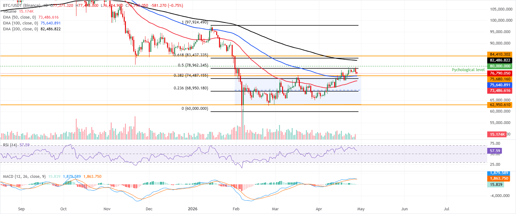 Bitcoin price is trading down near $76,800 on Tuesday after falling slightly the previous day. BTC is holding a constructive bullish bias as it stays above the 50-day and 100-day Exponential Moving Averages (EMAs), clustered around $73,486 and $75,640, respectively, while also riding the upper boundary of the parallel channel, whose top now offers nearby support at about $75,680.