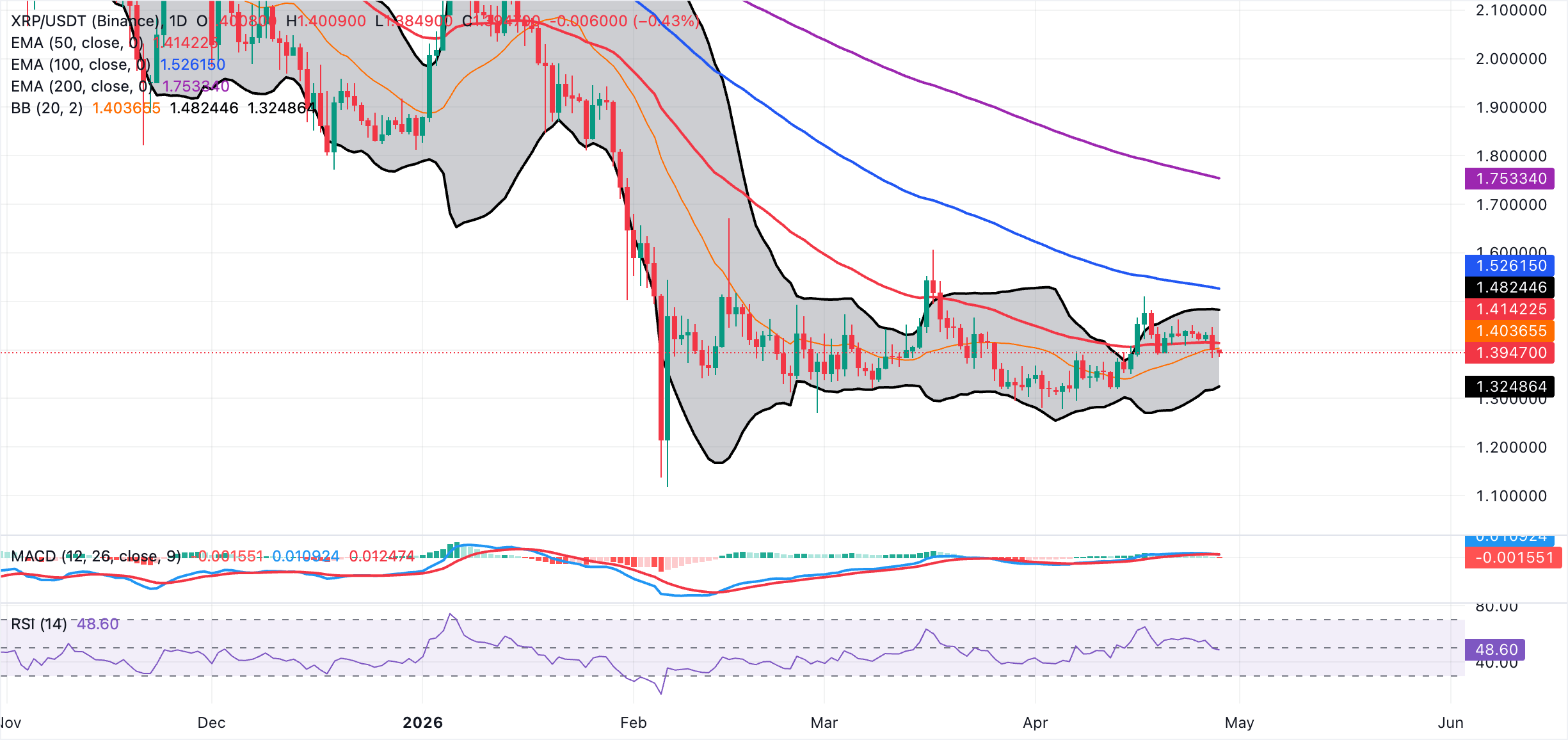 Beyond that supply range, the 100-day EMA at approximately $1.53 and the 200-day EMA around $1.75 form successive, more distant resistance layers. On the downside, the lower Bollinger band at about $1.33 provides the nearest support, and a clear break below it would expose XRP to a deeper pullback.