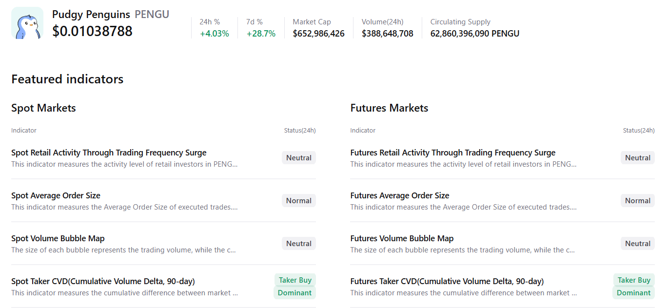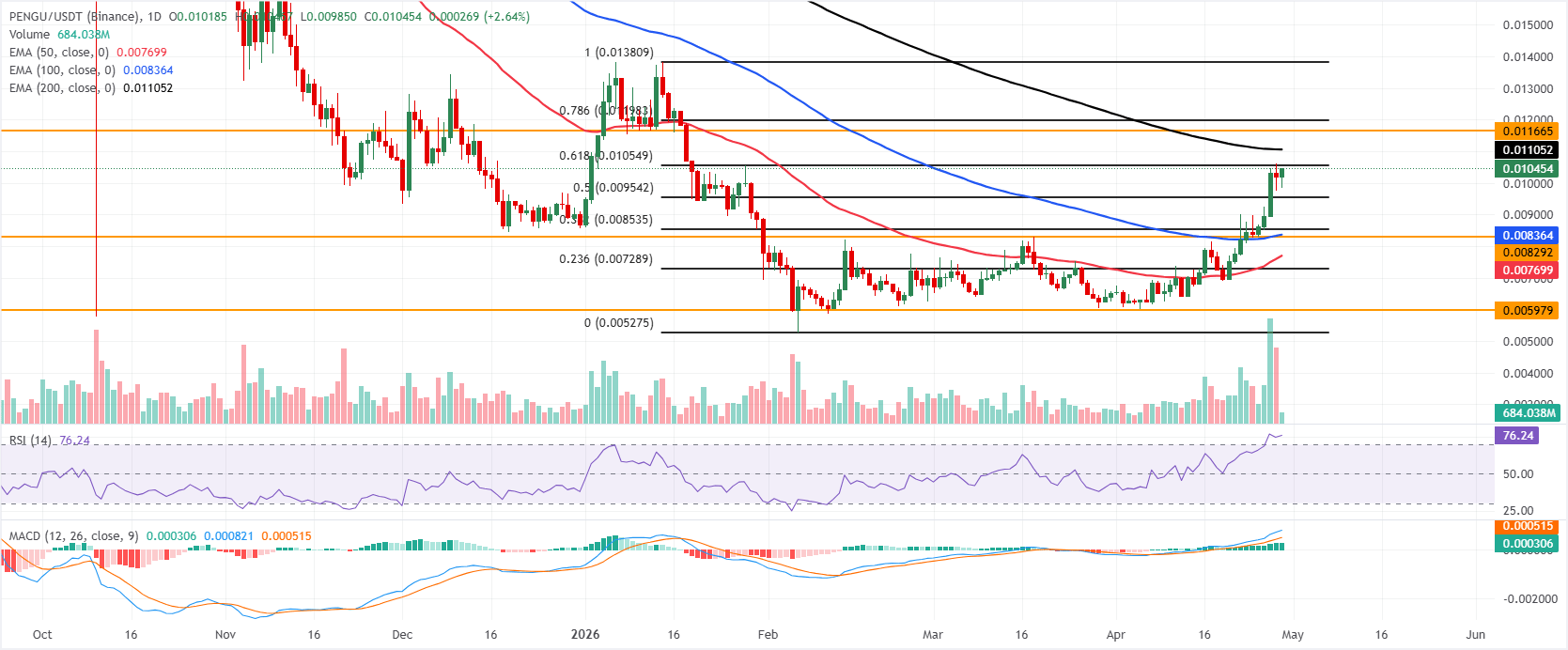 The Relative Strength Index (RSI) on the daily chart hovers in overbought territory near 76, and the Moving Average Convergence Divergence (MACD) remains positive, which together suggest strong but stretched upside momentum as PENGU challenges nearby resistance.