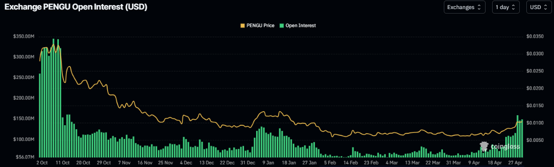 CoinGlass’ data show that PENGU futures Open Interest (OI) at exchanges rose to a yearly high of $158.89 million on Monday, up from $77 million last week, and remains steadily around $149 million on Wednesday. An increasing OI represents new or additional money entering the market and new buying, which could fuel the current PENGU price rally.