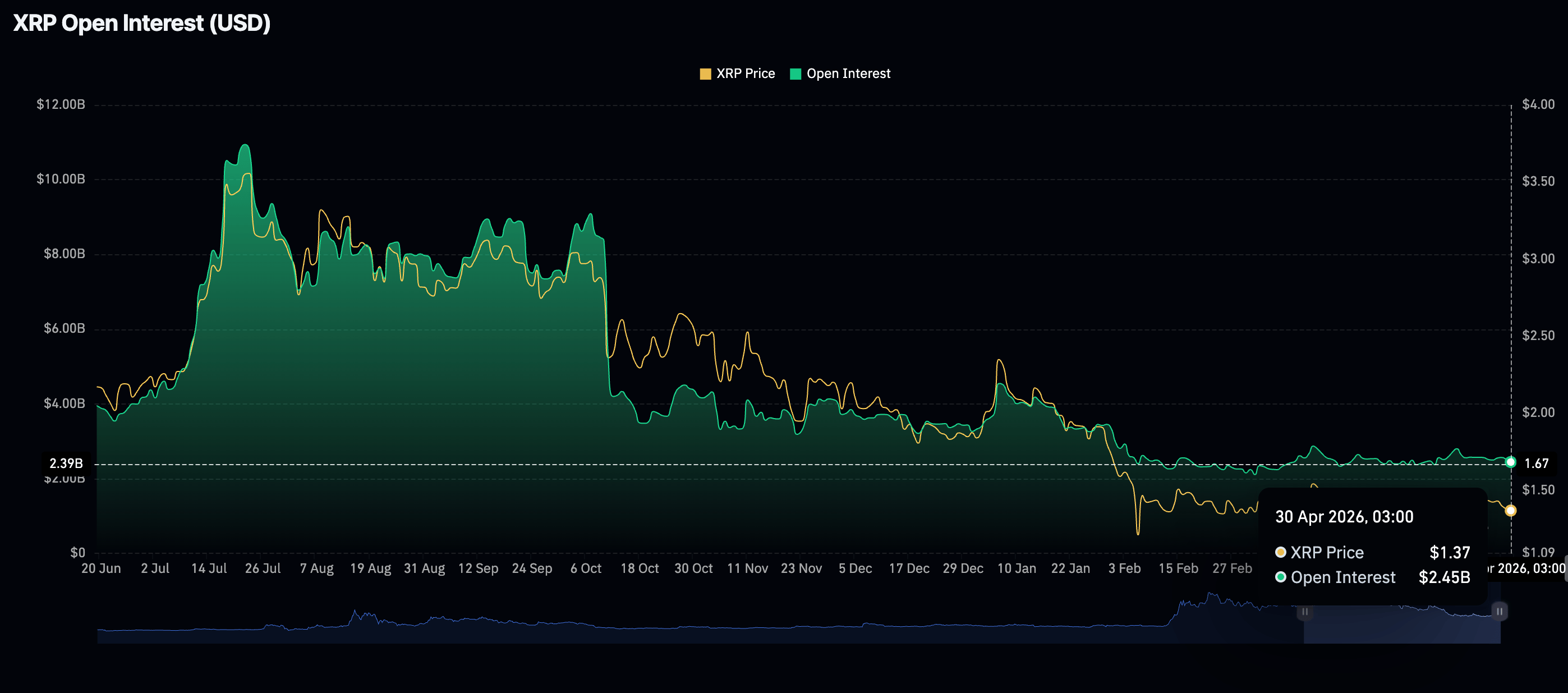 Retail investor participation in XRP appears to be waning, as indicated by a decline in perpetual futures Open Interest (OI) to $2.45 billion on Thursday from $2.52 billion the previous day.
